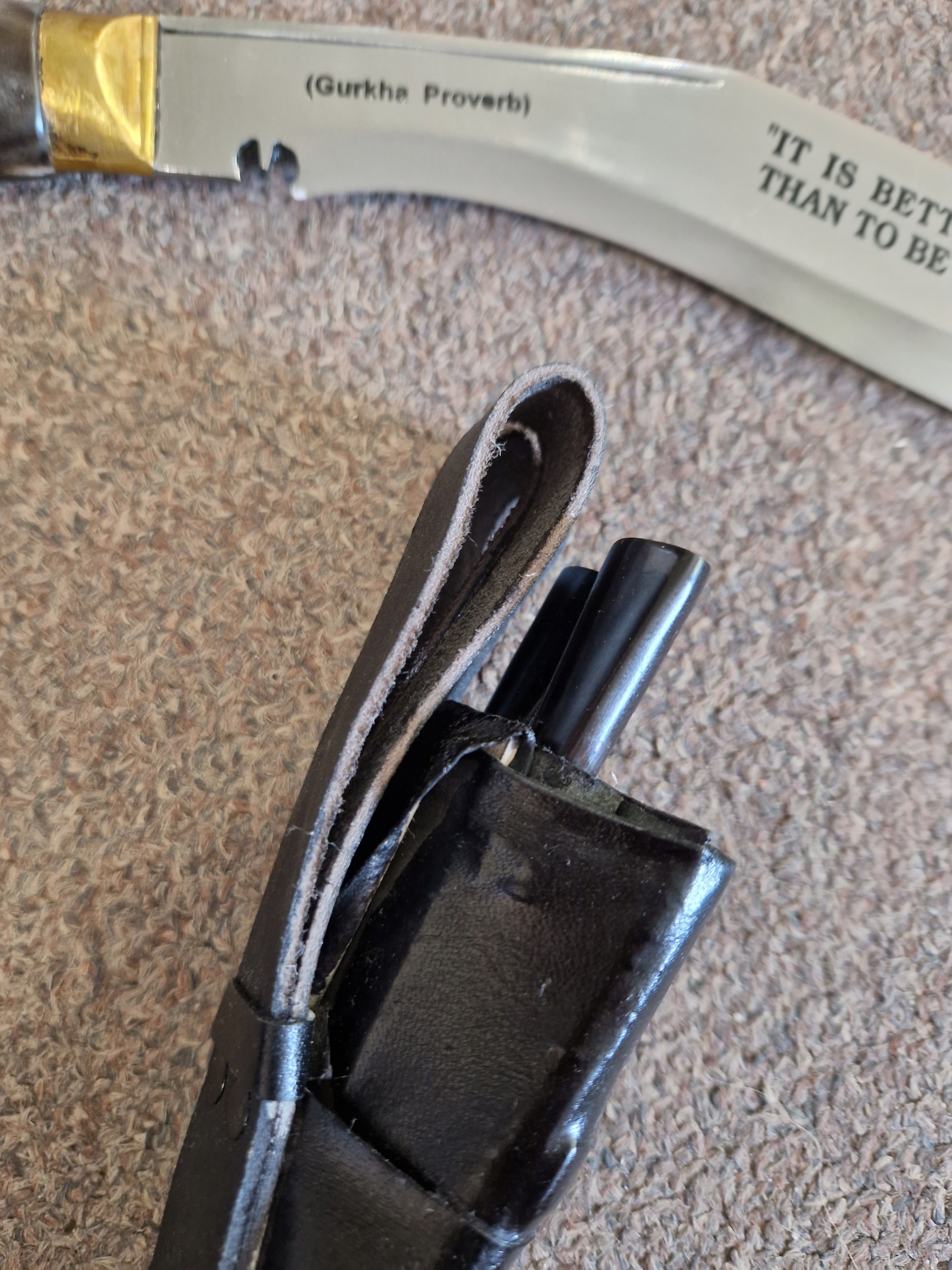 Includes Два ножі: карта (для прив’язки тварин) та чакмак (для освітлення вогню з кременем), приховані до піхви, підстриженої з натуральною водою, шкіряною водною, камуфляжною непальською мовою та довжиною леза: 26 см. (хребет): 11 мм