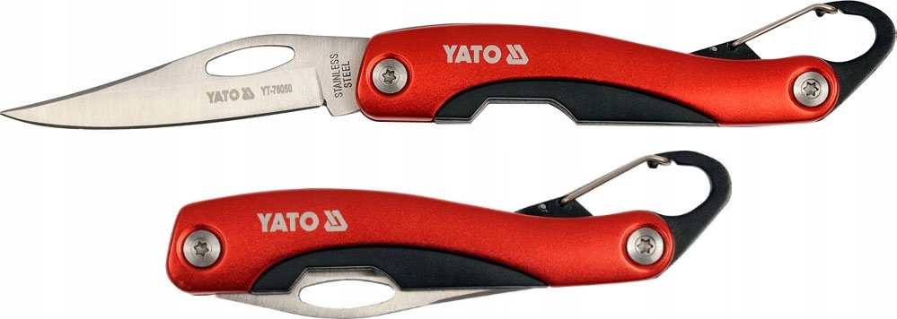 Легкий складаний ніж YATO з лезом типу «боуі» з нержавіючої сталі, довжиною 75 мм, анодованим металевим корпусом з великим карабіном.