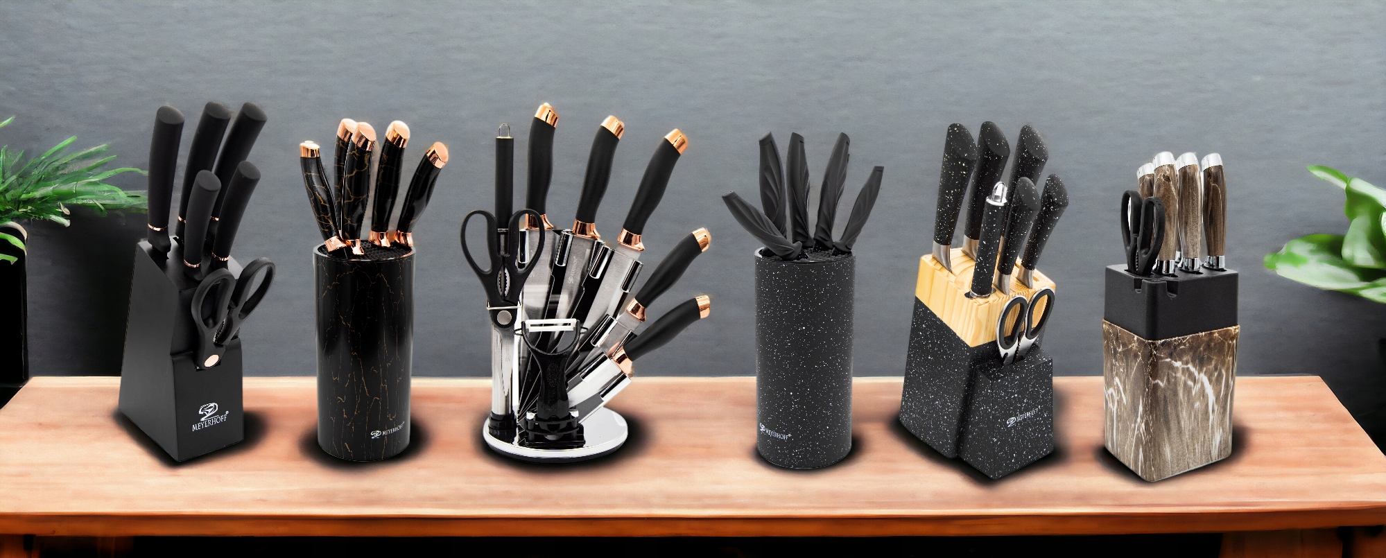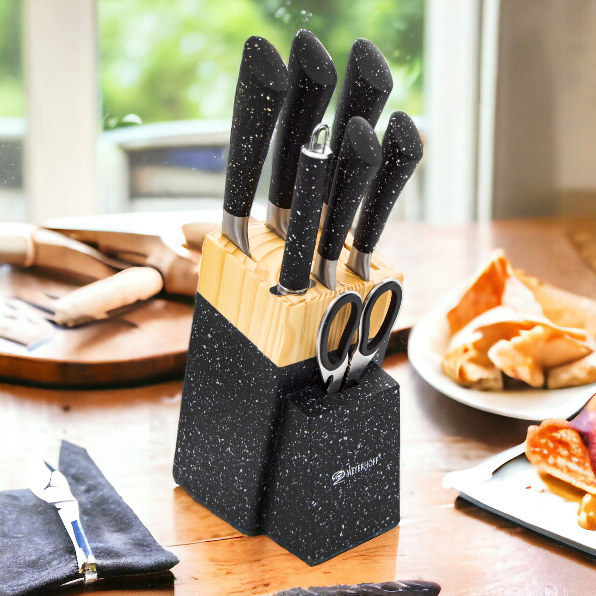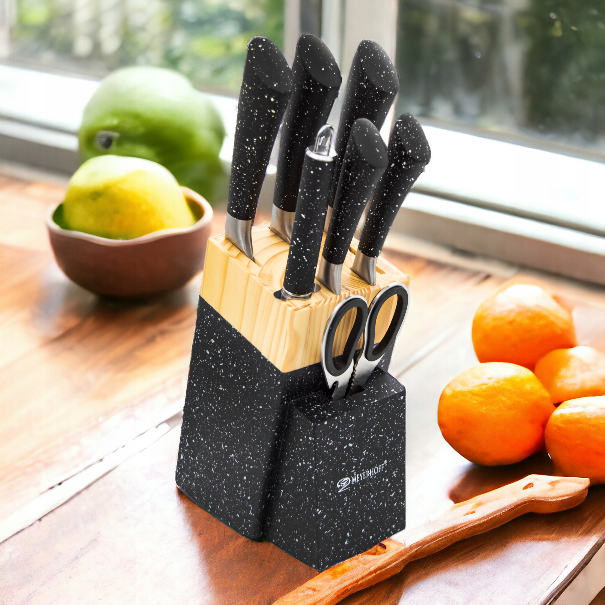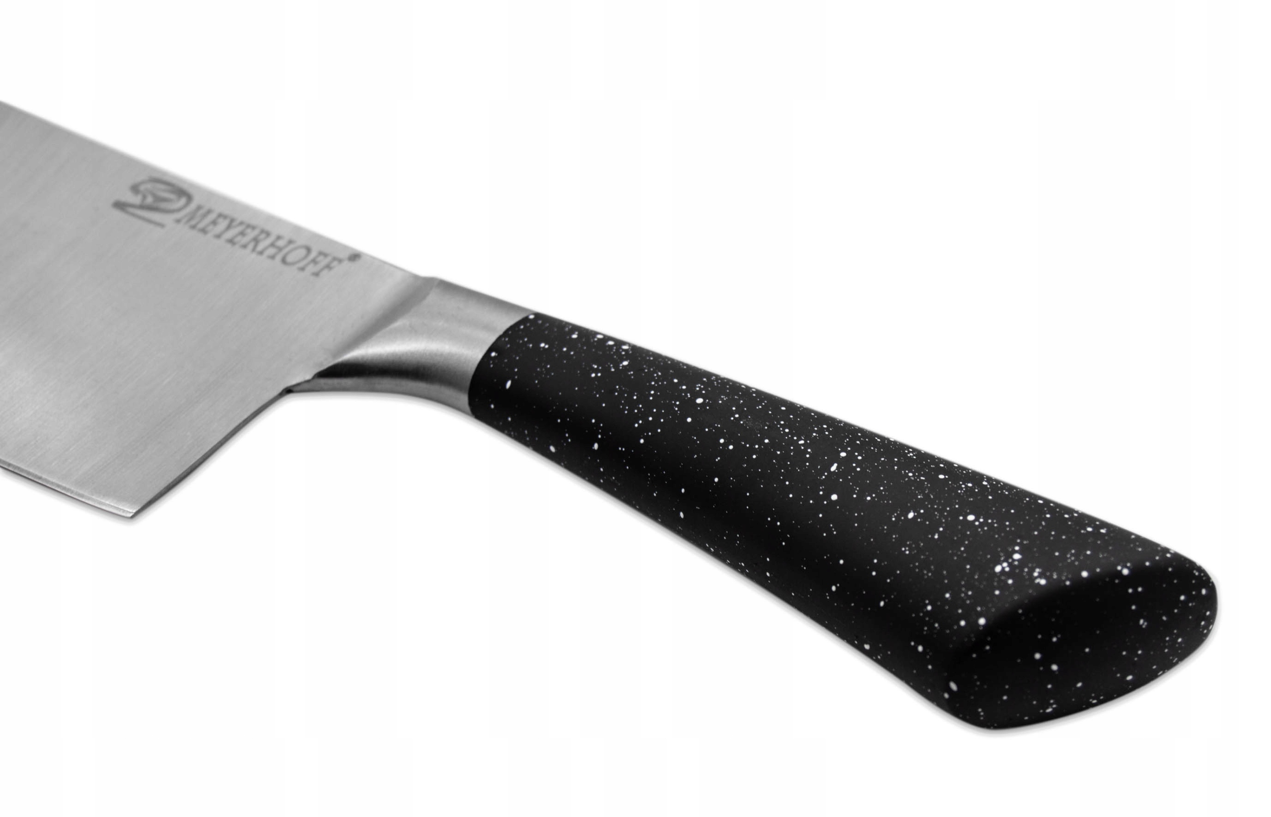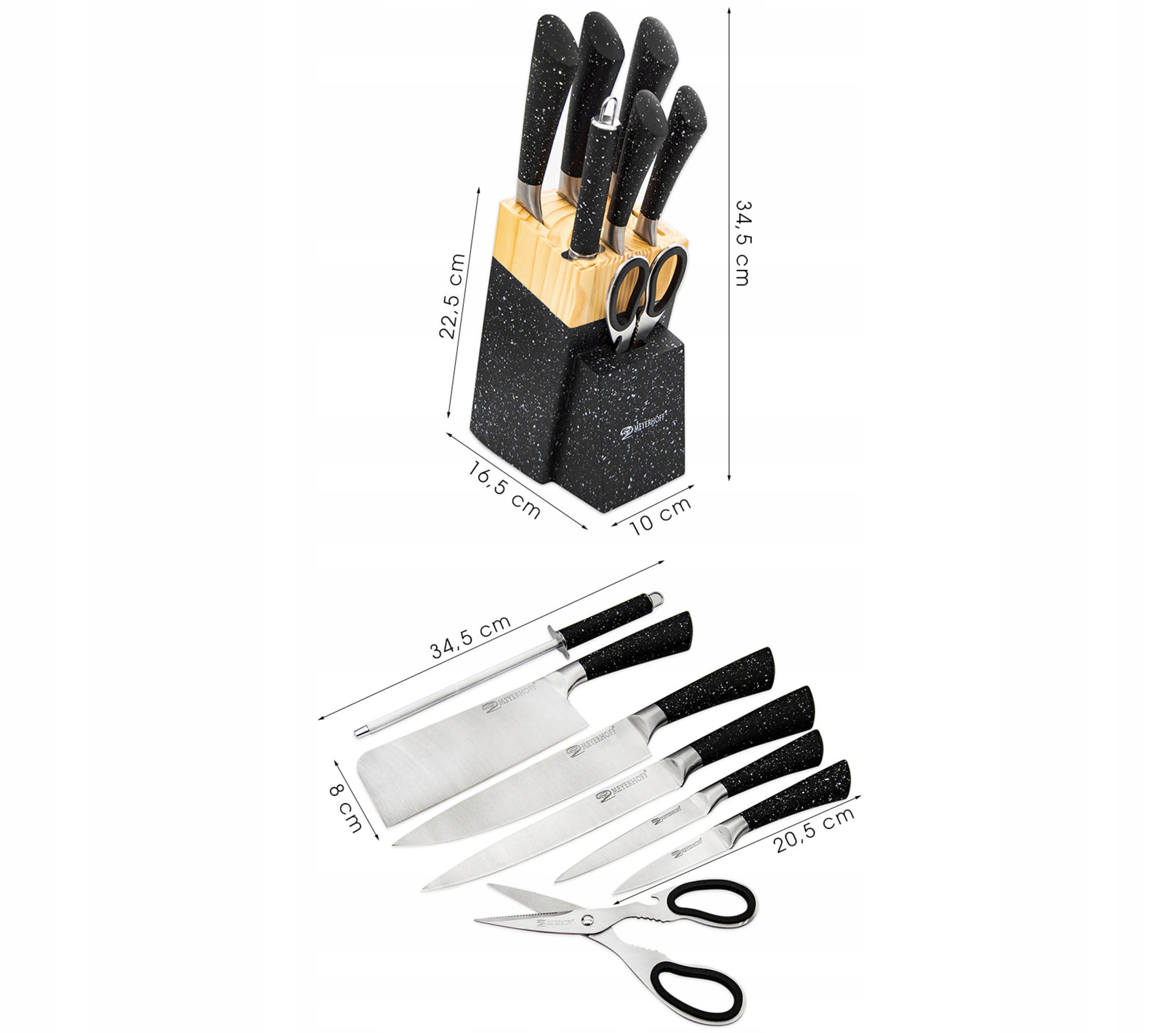 Нож, встановлений у бренді meyerhoff - найкращий спосіб зробити свій час, проведений на кухні. Унікальні леза виготовлені з високої якості нержавіючої сталі із підвищеною стійкістю до корозії та їх пластиковою ручкою . Набір складається з п’яти ножів різних розмірів, ножиць, точиків та стабільного блоку з функцією підставки. Сучасний та унікальний Блок з ножами вміститься у зовнішній вигляд кожної кухні, і в той же час зробить його більш практичним.