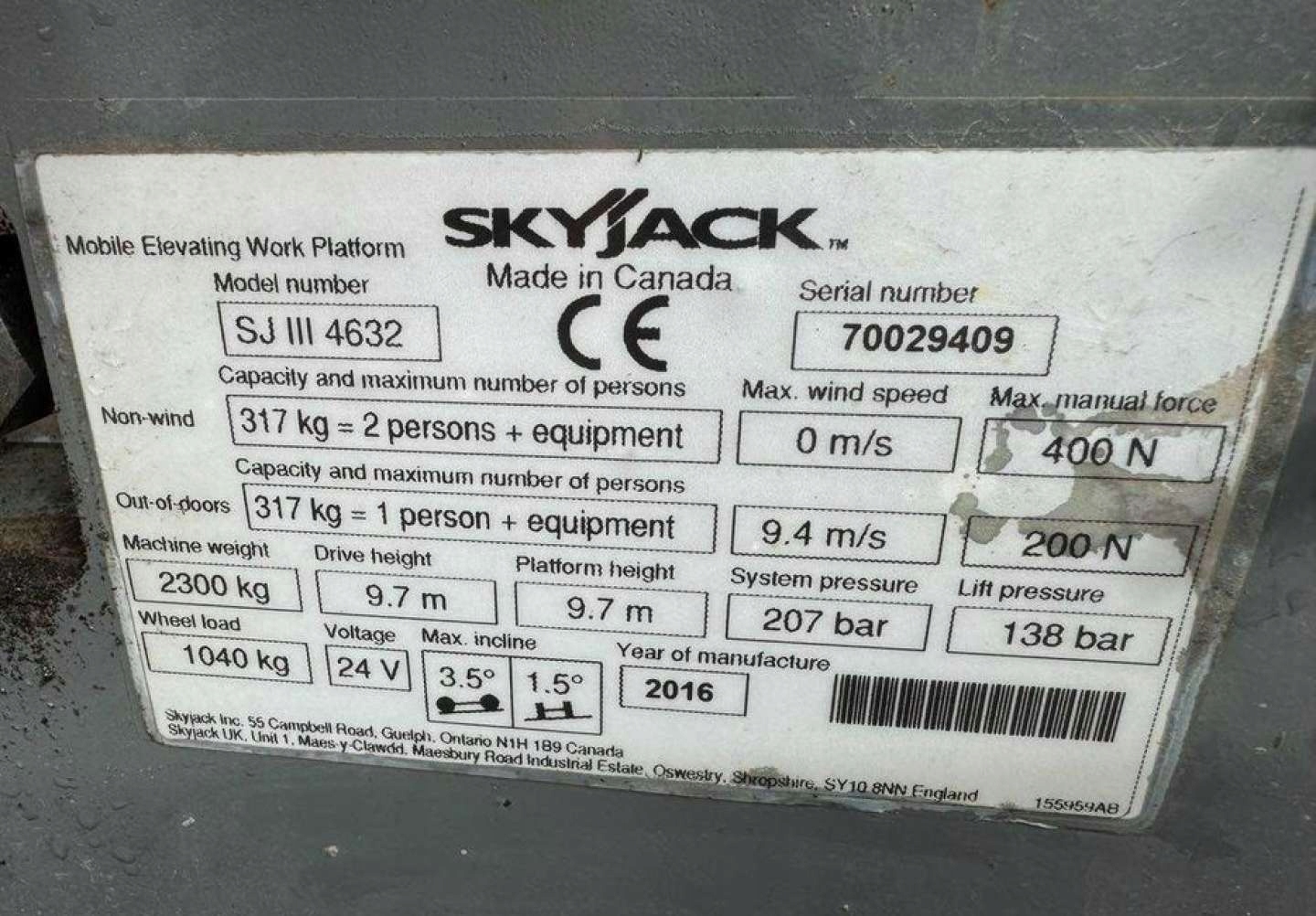 Повна технічна документація. Інструкція з експлуатації та обслуговування польською мовою. Декларація відповідності CE. Підйомник привезений зі Скандинавії, в країні не використовувався. Машина у відмінному технічному стані, чиста та доглянута. Ціна нетто: 32 000 зл. Брутто з ПДВ: 39 360 злотих