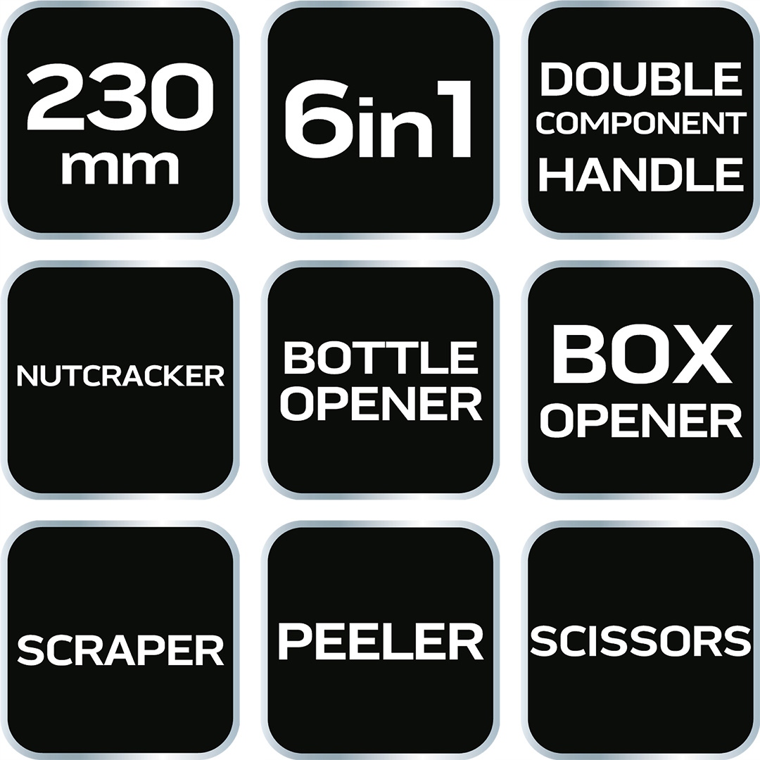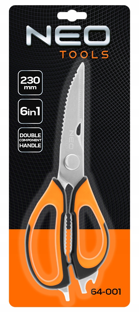 Ножиці 230 мм 6 в 1, 64-001 NEO - це ножиці довжиною 230 мм і 6 функціями в одному інструменті. Вони мають практичну двокомпонентну ручку та корпус, який можна розділити на дві частини. Їх можна використовувати як лускунчик, відкривач для пляшок, відкривач для ящиків, скребок і очищувач. Їх можна використовувати вдома, в гаражі або в майстерні. Висока міцність ножиць NEO забезпечить довгі роки використання.