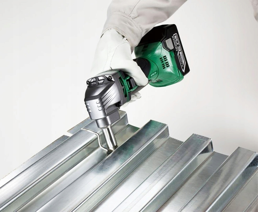 Акумуляторні гофровані ножиці для листового металу CN18DSL HiKOKI оснащені 2-вольтовим двигуном. Пристрій працює від вставних акумуляторів напругою 14,4В і 18В. Це рішення робить батарею більш сумісною, але пам’ятайте, що продуктивність батареї 18 В набагато вища порівняно з батареєю 14,4 В. Що означає ефективність, швидкість і робочий час. Спеціальна конструкція пуансона дозволяє різати не тільки вперед, але і вбік, з невеликими втратами матеріалу. Діаметр різальної канавки становить 5 мм, а весь отриманий матеріал спрямований вниз і не перекриває лінію різу. Нам потрібно вирізати складні візерунки, цей апарат впорається без проблем, мінімальний радіус різу 40 мм. Швидкість різання 1,8 м забезпечує дуже ефективну роботу. На одному заряді батареї 5Ah 18V ми можемо розрізати 20 м листового металу. Термін служби ріжучого агрегату становить близько 300 м в залежності від матеріалу, що розрізається, і його товщини. Різання здійснюється таким чином, що пуансон, рухома частина ножиць, притискає матеріал до матриці зі швидкістю 2500 ударів на хвилину, вирізаючи листовий метал. Виробник HiKOKI також спростив заміну щіток - це можна зробити, не розбираючи корпус, просто відкрутіть встановлені в ньому спеціальні ковпачки. Відсутність кабелю означає, що він не обмежує рухи, що полегшує роботу на даху. Відсутність зайвих проводів під ногами підвищує безпеку роботи на висоті.