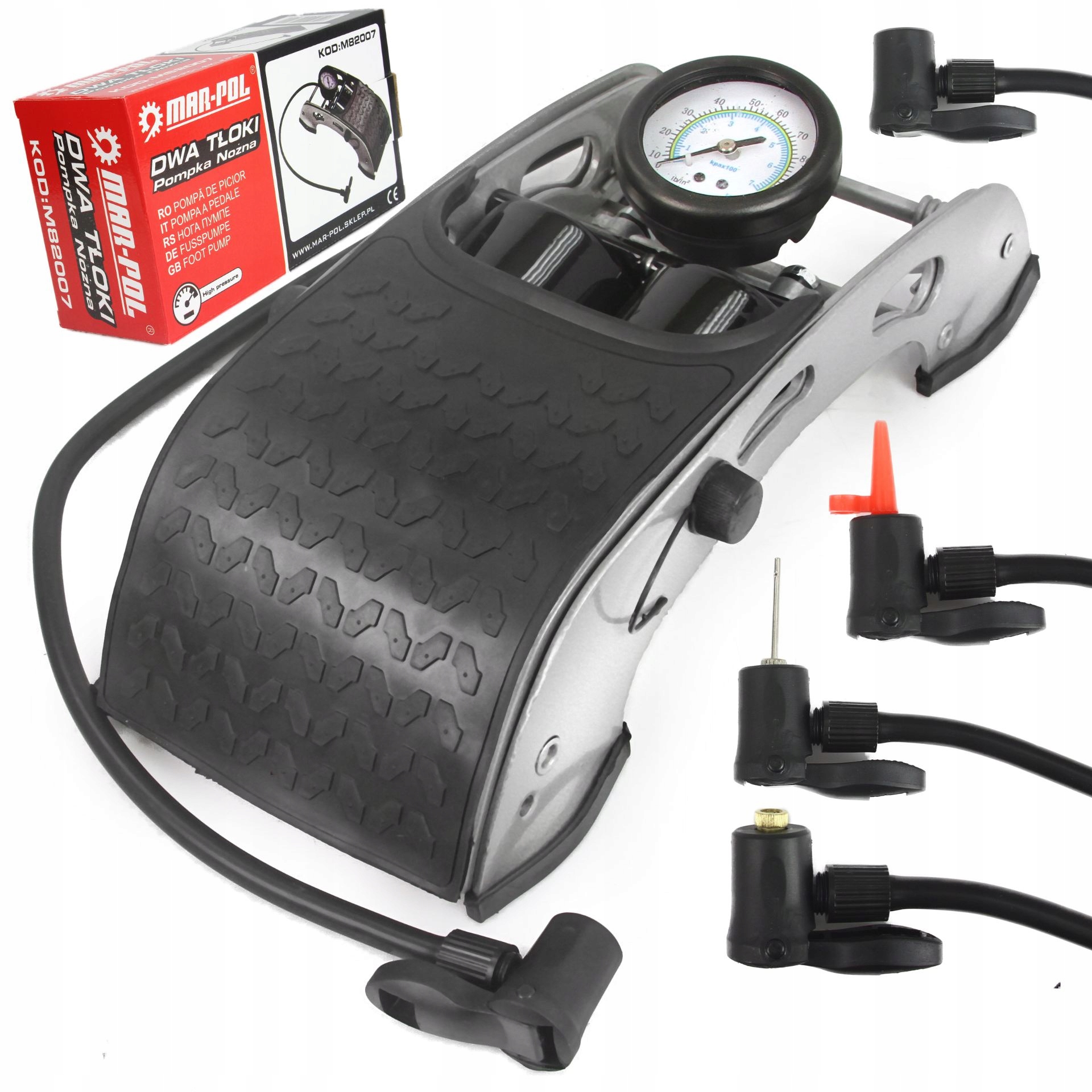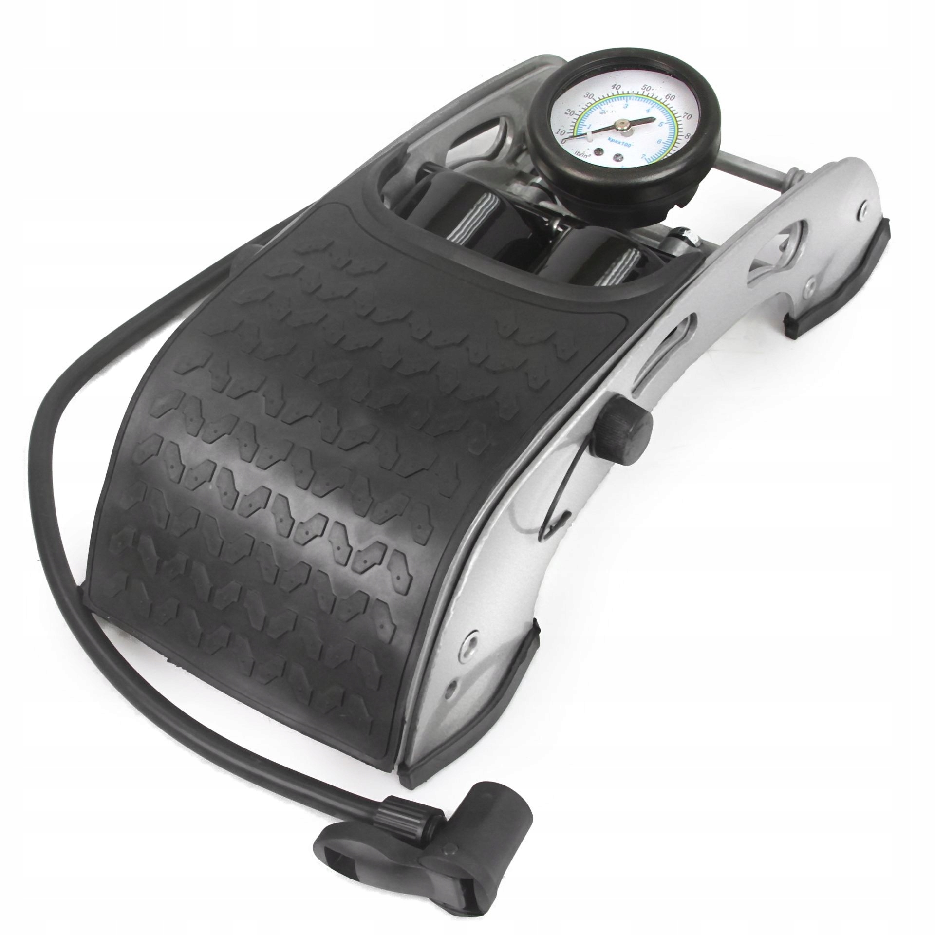 Оснащений точним манометром. У набір також входять спеціальні насадки для надування м'ячів, матраців, велосипедів тощо.
