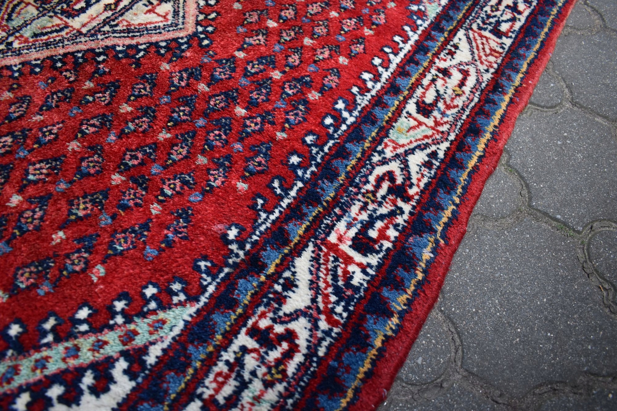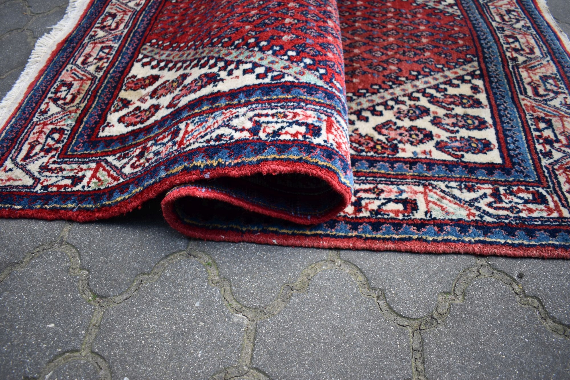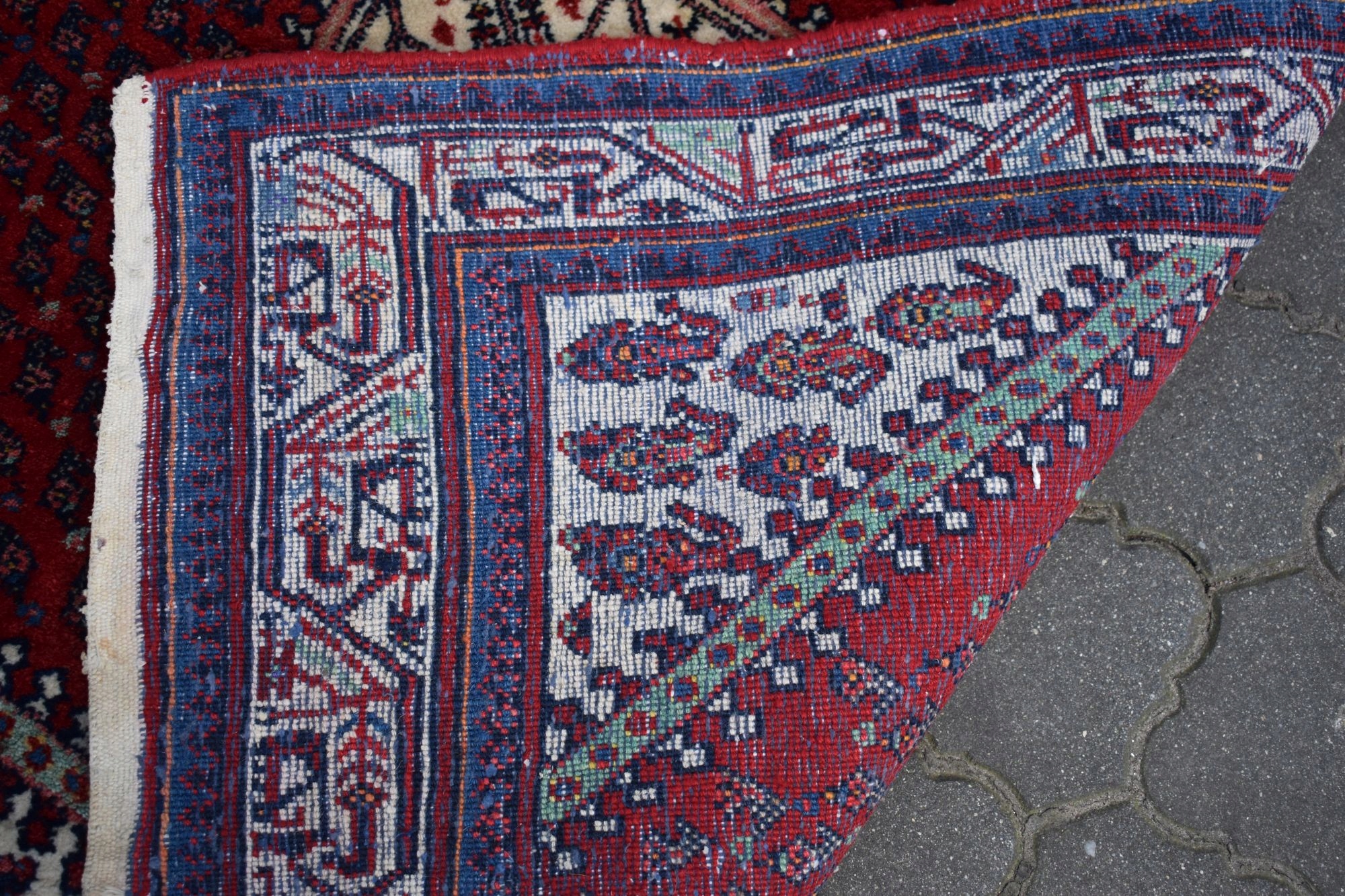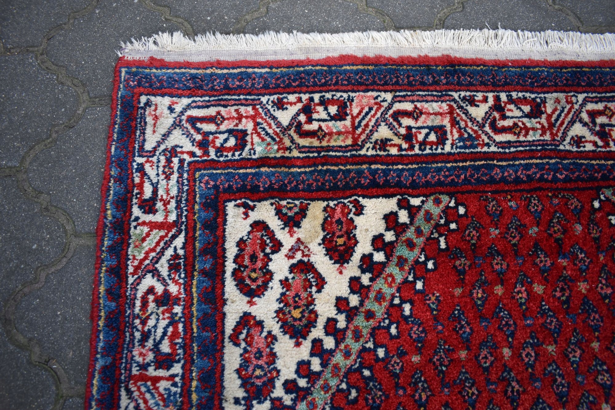 адвокат експертів. З одного боку, килим спочатку був закінчений переплетенням вузла, з іншого з бахромою.