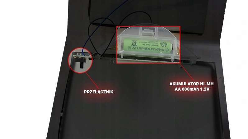 Усередині є перемикач, який активує датчик підсвічування, а також слот для батарейки типу АА, яку можна замінити, якщо вона розряджається, заощаджуючи гроші.
