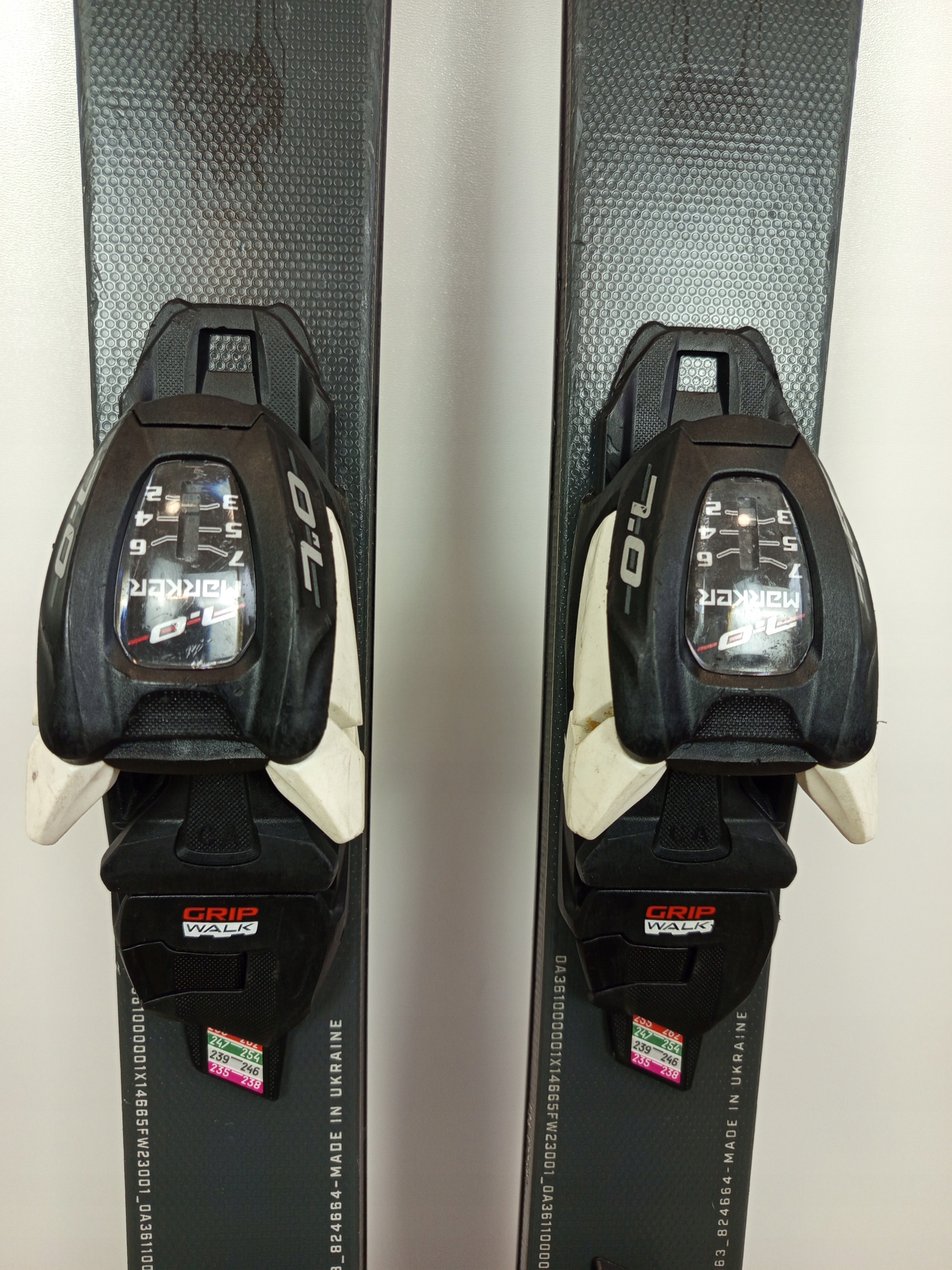сліди нормального використання - порізи та невеликі потертості та подряпини на графічному дизайні лиж та кріплень