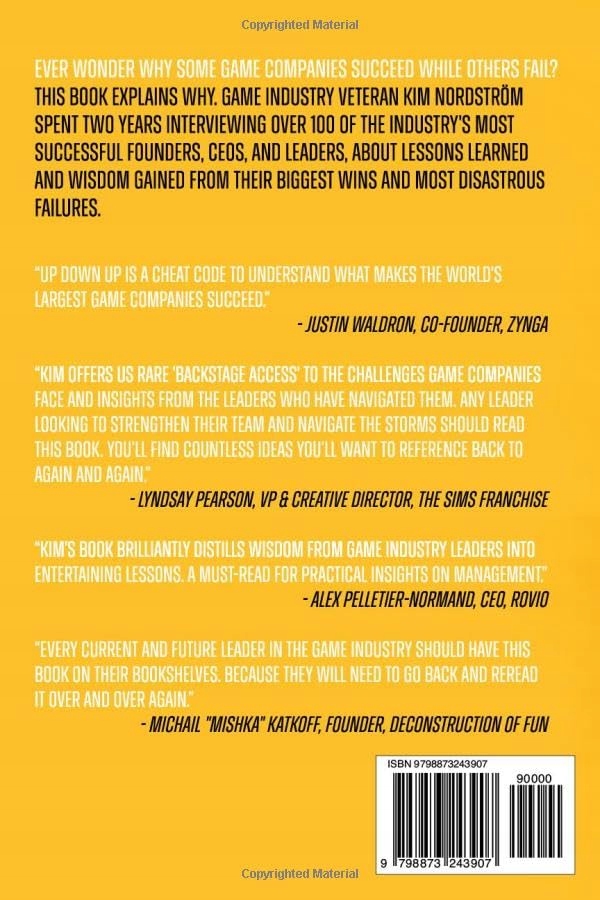 Ви коли-небудь замислювалися, чому одні ігрові компанії досягають успіху, а інші зазнають невдачі? Ця книга пояснює чому. Ветеран ігрової індустрії Кім Нордстрьом провів два роки інтерв’ю з понад 100 найуспішнішими засновниками, генеральними директорами та керівниками індустрії про уроки та мудрість, отриману в результаті їхніх найбільших перемог і найкатастрофічніших невдач. UP DOWN UP допоможе вам орієнтуватися у вашій ігровій компанії через успіхи та невдачі. UP DOWN UP — це чіт-код, щоб зрозуміти, що робить найбільші світові ігрові компанії успішними. - Джастін Волдрон, співзасновник Zynga Кім пропонує нам рідкісний «доступ за лаштунки» до викликів, з якими стикаються ігрові компанії, і думки лідерів, які керували ними. Цю книгу повинен прочитати будь-який лідер, який прагне зміцнити свою команду та подолати шторми. Ви знайдете незліченну кількість ідей, до яких захочете повертатися знову і знову. - Ліндсей Пірсон, віце-президент і креативний директор, франшиза Sims Книга Кіма блискуче перетворює мудрість лідерів ігрової індустрії в розважальні уроки. Необхідно прочитати, щоб отримати практичні знання про менеджмент. - Алекс Пеллетьє-Норманд, генеральний директор Rovio Книга Кіма містить деякі з найкращих військових історій про безкоштовні ігрові компанії, які коли-небудь були зібрані. - Крістіан Сегерстрале, генеральний директор Super Evil Megacorp Кожен нинішній і майбутній лідер ігрової індустрії повинен мати цю книгу на своїх книжкових полицях, тому що їм доведеться повертатися і перечитувати її знову і знову. – Михайло «Мішка» Каткофф, засновник Deconstruction of Fun Ця книга — дивовижна скарбниця мудрості. - Кріс Вілсон, співзасновник і генеральний директор Grinding Gear Games UP DOWN UP містить цитати та історії деяких найуспішніших лідерів і творців ігрових компаній у світі: Олександр Серопян, співзасновник Bungie Ар’ян Бруссі, співзасновник Guerilla Одрі Лепринс, співзасновник і генеральний директор Game Bakers Брендан PLAYERUNKNOWN Грін, творець PUBG Каролін Кренцер, співзасновник і генеральний директор Trailmix Девід Хелгассон, співзасновник і перший генеральний директор Unity Емілі Грір, співзасновник і колишній генеральний директор Kongregate Фредрік Вестер, генеральний директор Paradox Interactive Гері Дейл, генеральний директор Sega Europe Гамільтон Чу, співзасновник і генеральний директор, Друга вечеря Ян Лівінгстон, співзасновник і генеральний директор Games Workshop Ігор Бухман, співзасновник і співгенеральний директор Playrix Ілкка Паананен, співзасновник і генеральний директор Supercell Йоакім Арчен, співзасновник і попередній CPO, Next Games Джастін Волдрон, співзасновник Zynga Крістіан Сегерстрале, генеральний директор Super Evil Megacorp Ліндсей Пірсон, віце-президент і креативний директор франшизи Sims Марія Саянс, генеральний директор UsTwo Михайло «Міська» Каткофф, засновник Deconstruction of Fun Ніклас Хед, співзасновник і перший генеральний директор Rovio Ріна Онур Сіріноглу, співзасновник Peak Роб Пардо, попередній CCO, Blizzard Самулі Сивахуоко, співзасновник і перший генеральний директор Remedy Себастьян Кнутссон і Ріккардо Закконі, співзасновники, King Софі Во, засновник, Rise & Play Уоррен Спектор, креативний директор Deus Ex & Disney Epic Mickey і багато іншого...