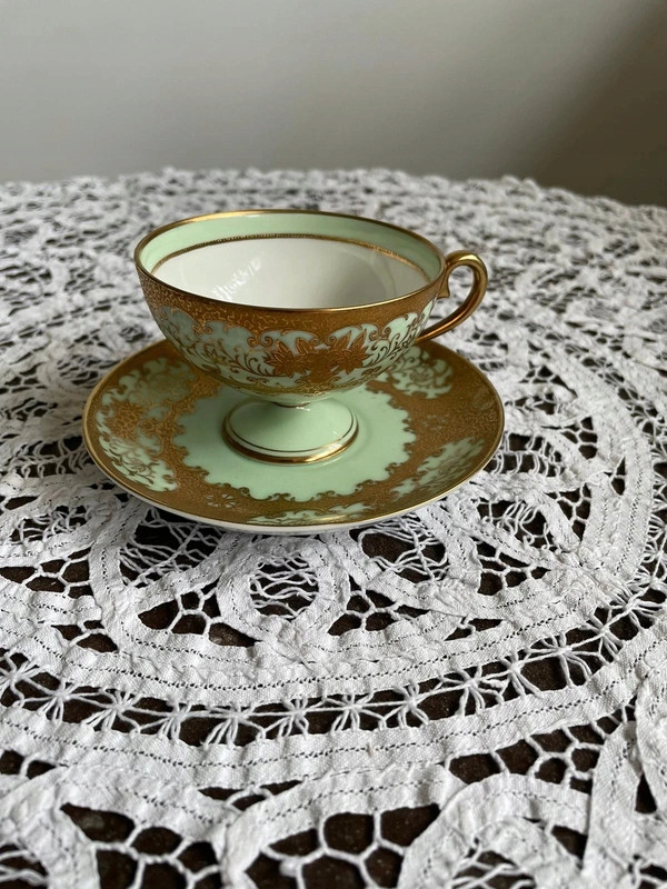 Порцеляна м'ятного кольору, прикрашена товстою вишуканою позолотою. Позолочені краї та ручка. Висота чашки 6 см, діаметр наповнювача 8,5 см. Блюдце 13 см