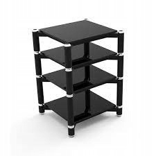 - чорні металеві основи та товсті (15 мм) полиці з чорного скла або бамбука з рішенням для гасіння вібрації