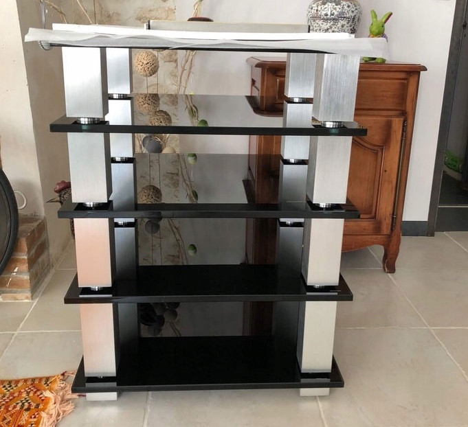 Полиці виготовлені Загартоване скло товщиною 19 мм у поєднанні з матовими алюмінієвими колонами надає Square Hifi естетику, яка є масивною, домінуючою, демонструє, наскільки музика важлива для вас, а також це стиль, який легко інтегрувати в будь-який тип інтер’єру. Його квадратна архітектура з роздільними шипами на кожній полиці значною мірою пояснює непохитну стабільність цілого. Усі елементи незалежні один від одного, і їх можна змінювати та розташовувати відповідно до ваших уподобань.