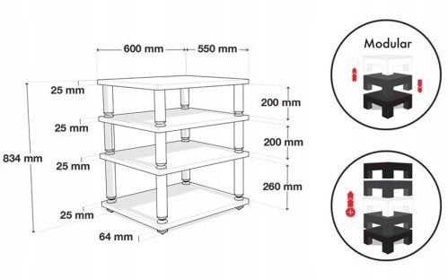Увесь предмет меблів ідеально оброблений, а деталі вишукані. Відстань між полицями становить від 20 до 26 см, що дозволяє розмістити навіть великі компоненти Hi-Fi або домашнього кінотеатру. Можливе навантаження всього столу до 200 кг (50 кг на кожну полицю). Модулі можна додавати або видаляти за потреби (необов’язково).