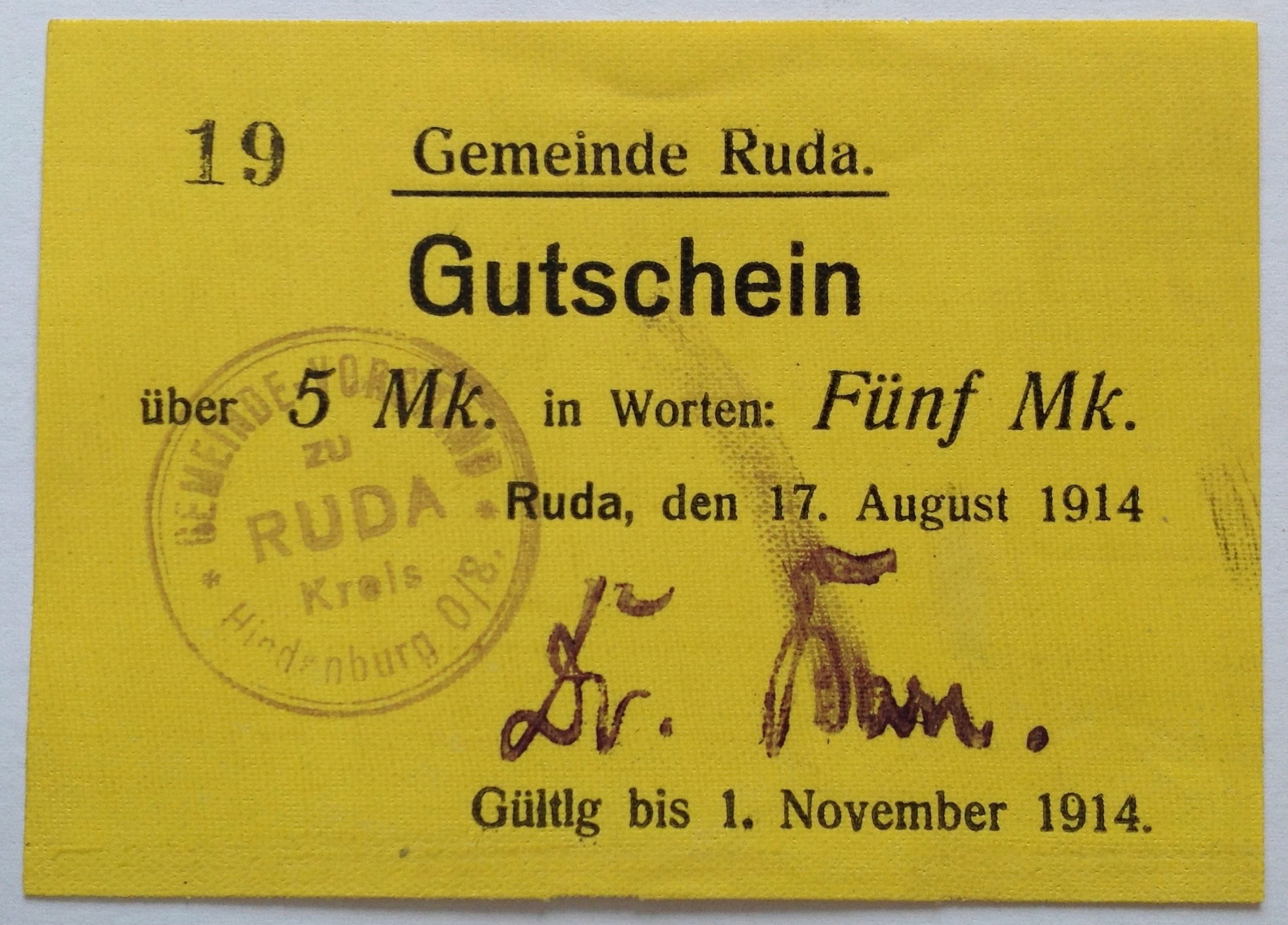 NOTGELD-BON RUDA 5 MK 1914 KR.HINDENBURG (ZABRZE)