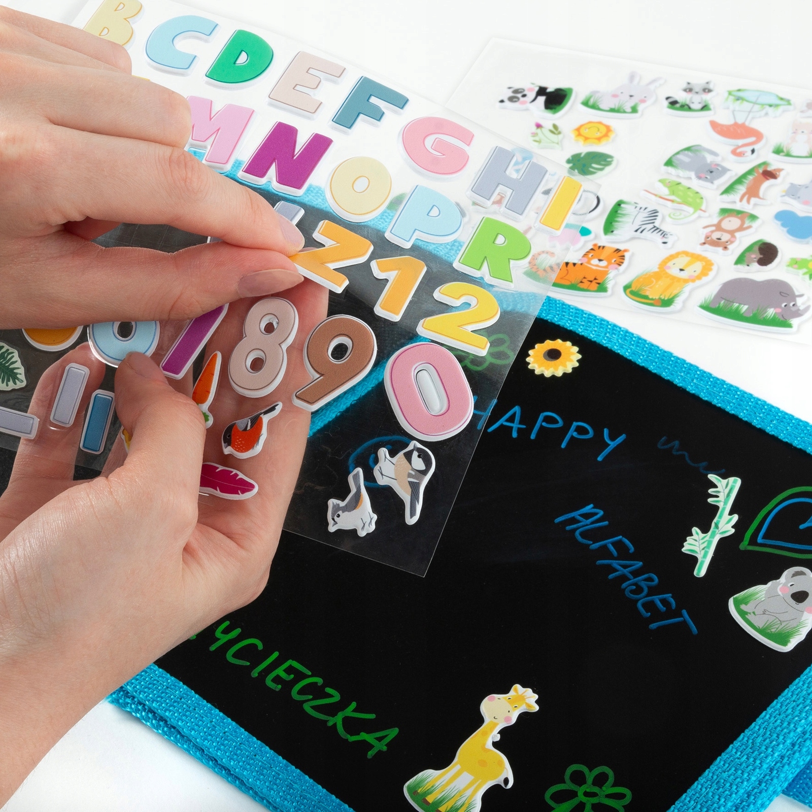Буклет містить 6 сторінок для навчання та гри. Кожен з них - це багаторазове використання , ми можемо мити малюнки мокрою тканиною або губкою і знову почати колір, наклейки також можуть бути склеєні та очищені. 3D наклейки
