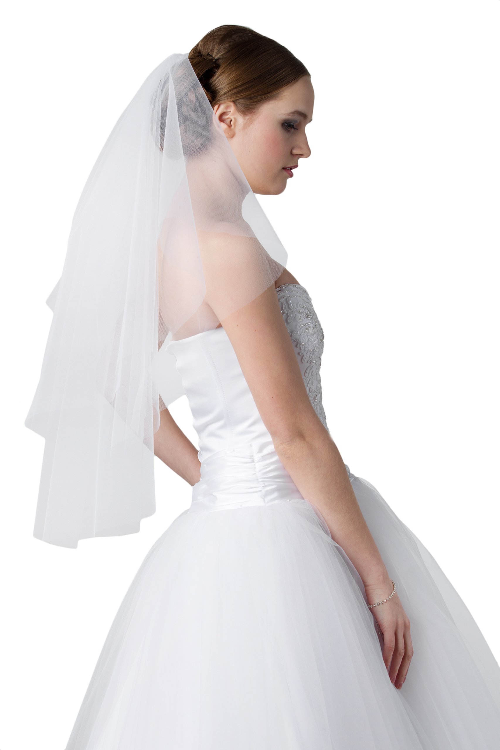 Пропонуємо вашій увазі красиву весільну фату з тюлю білого кольору або кольору екрю. Фата двошарова розміром 65/80 см. Він кріпиться до безбарвного гребінця, що полегшує кріплення до волосся.
