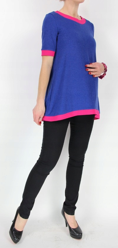 ТУНІКА З ВІСКОЗИ, СИНЯ, З ДОДАВАННЯМ МЕЛАНЖЕВОЇ НИТКИ, ОБРОБКА ФУКСІЯ - ОБИДВА КОЛЬОРИ ПРАЦЮЮТЬ ІДЕАЛЬНО.