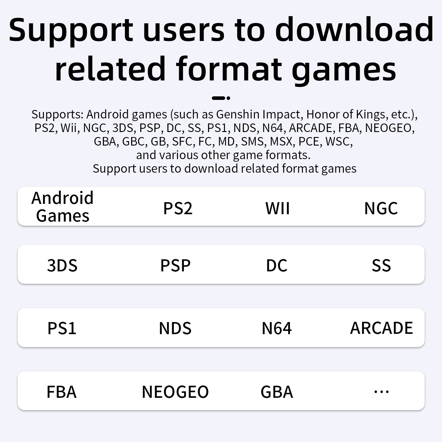 - Ігри: підтримка: ігри для Android, PS2, PS1, DC, NDS, ARCADE, GBA, GBC, GB, SFC, FC, MAME, MD, GG , PCE, NGPC, SMS, WSC та інші формати ігор. Підтримка користувачів у завантаженні ігор у схожих форматах.