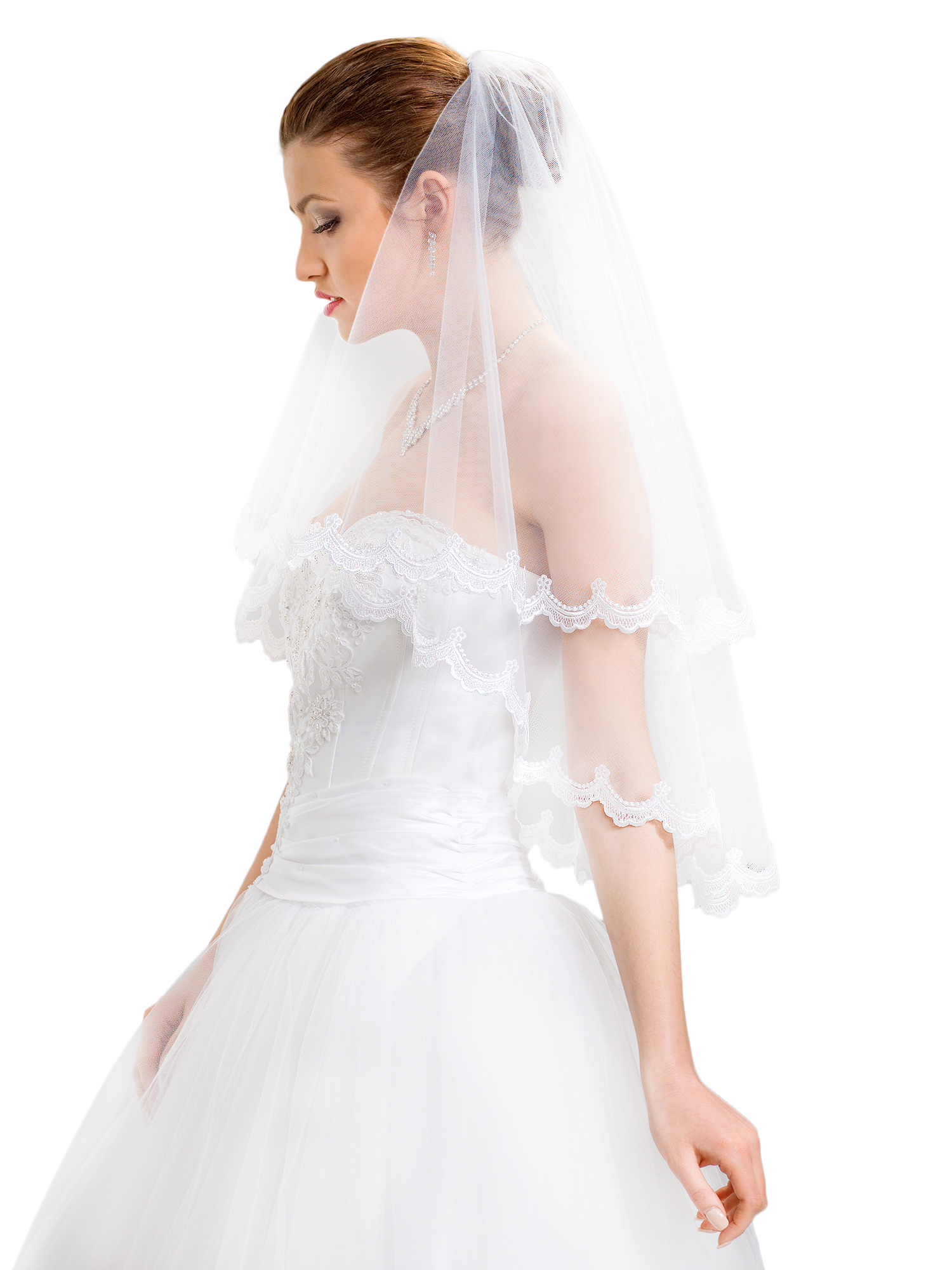 Пропонуємо вашій увазі красиву весільну фату з тюлю білого кольору або кольору екрю. Фата двошарова, розміром 55/75 см, оброблена красивим мереживом. Він кріпиться до безбарвного гребінця, що полегшує кріплення до волосся.