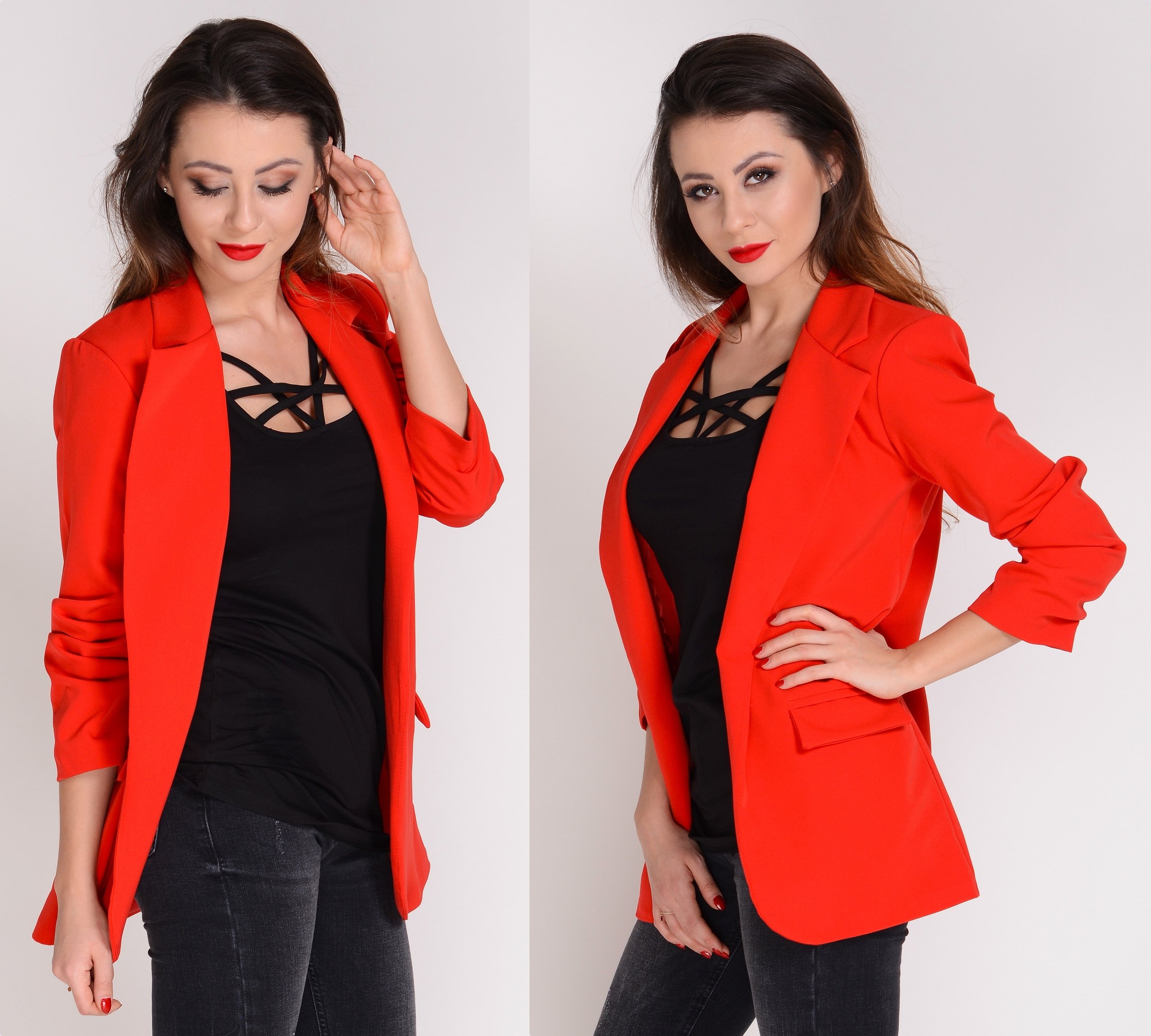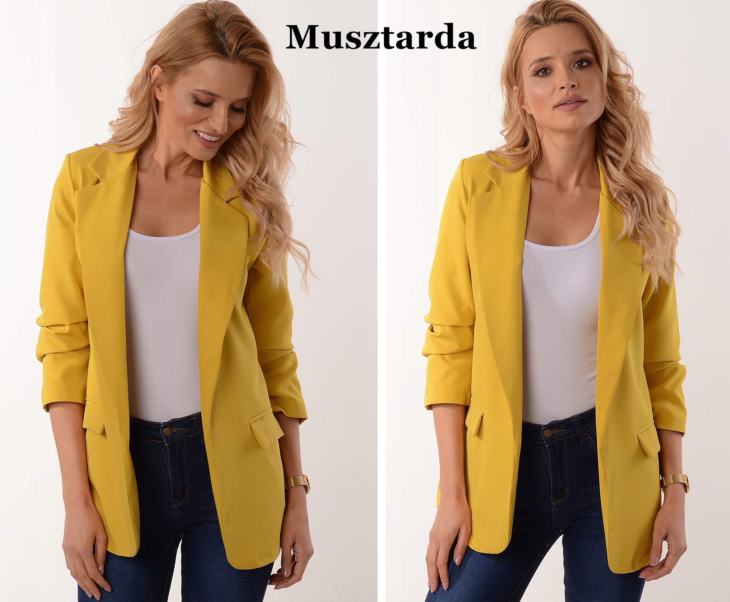Довга модель, смокінг, підходить як для елегантного, так і для повсякденного стилю. Чудове доповнення до стилю для роботи, навчання або вечірнього виходу. Драпіровані рукави довжиною 3/4 додають оригінальний характер. Дві кишені з боків з ефектними клапанами прикрашають куртку. Вільний крій, з підкладкою та м’якими наплічниками.
