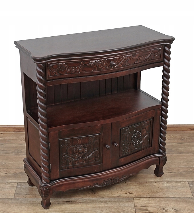 Чарівний дерев'яний предмет меблів із зігнутими ніжками та красивим різьбленням. Має практичну тумбу та висувний ящик.
