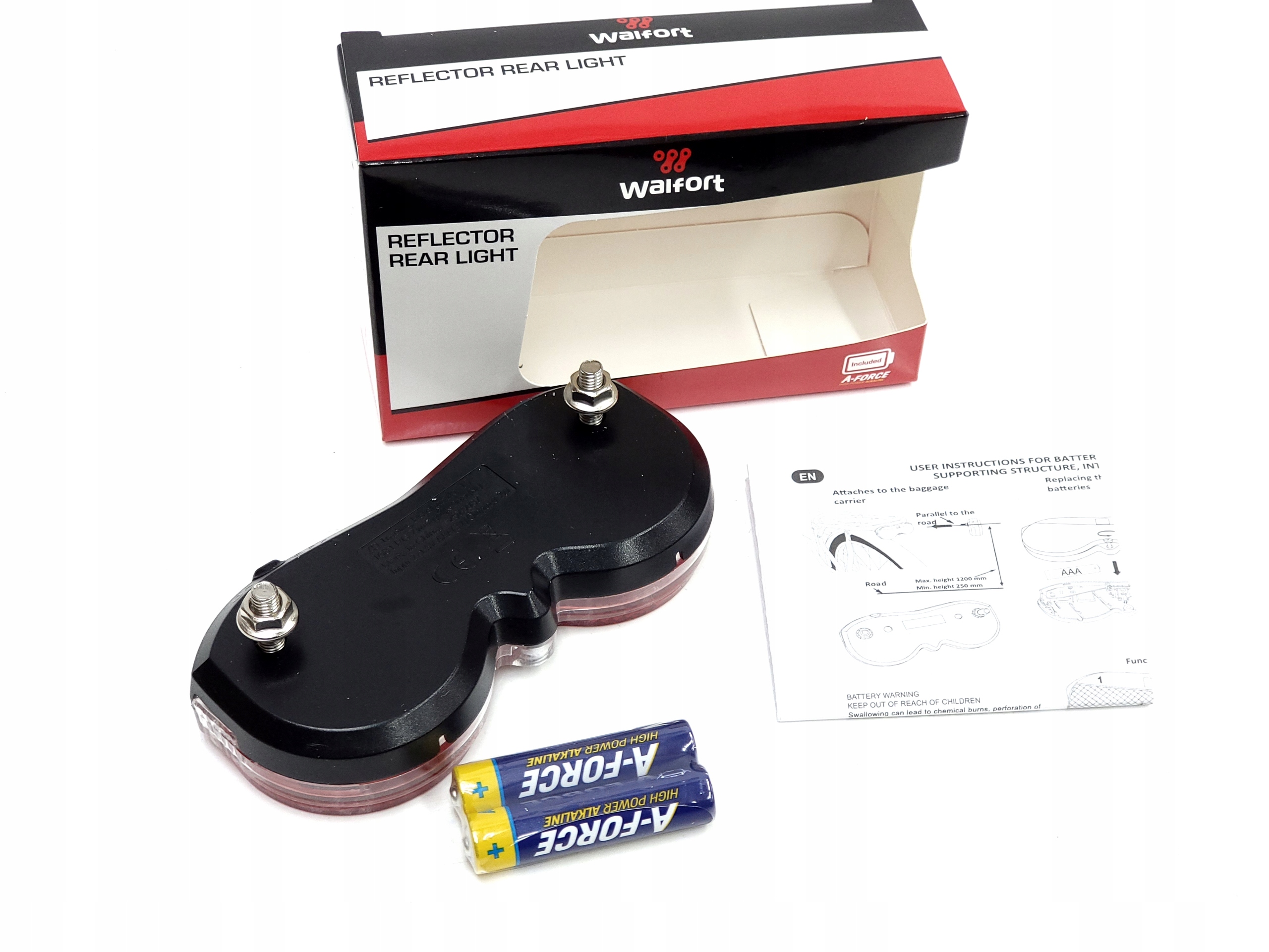 Нова задня лампа, встановлена на багажнику для всіх велосипедів з такими кріпленнями, включаючи універсальні велосипеди Tyler тощо. Включається лампа з сильним світлодіодним світлом, що працює на двох батареях AAA. Монтажні отвори відстані: 8 см