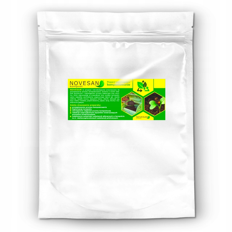 NOVESAN – мікробіологічний препарат, призначений для прискорення процесу компостування. Він складається з корисних і непатогенних бактеріальних штамів, які під час свого метаболізму виробляють ферменти, відповідальні за правильне та швидке компостування органічних відходів, таких як: залишки рослин, опале фрукти, скошена трава, шкірка, яєчна шкаралупа, кавова та чайна гуща, деревна зола, папір, кора, тирса та подрібнені гілки.