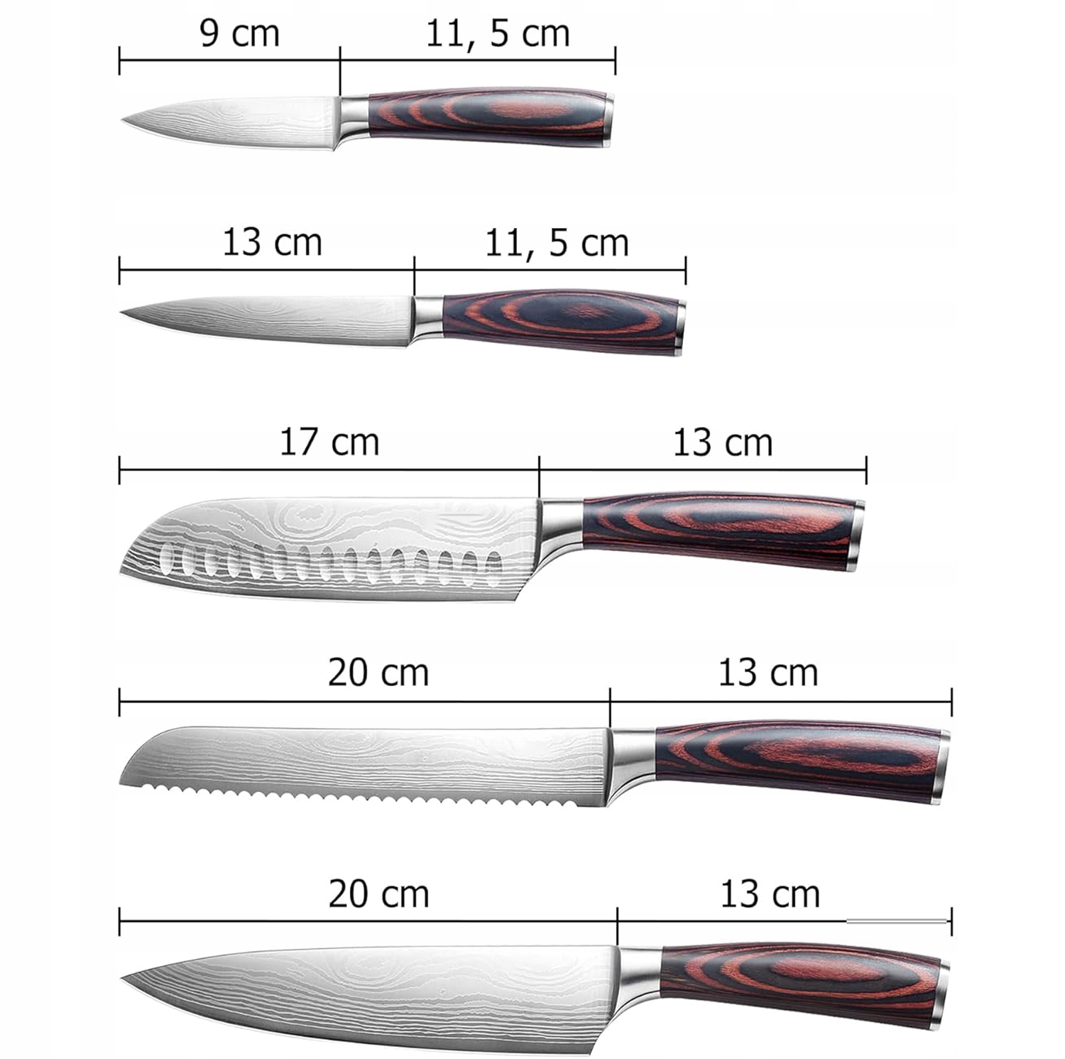- Набір ножів преміум -класу включає нож шеф -кухаря 20 см, 20 см ножа Сантоку, універсальний ніж 13 см, хлібний ніж 20 см, нож для овочів 9 см.