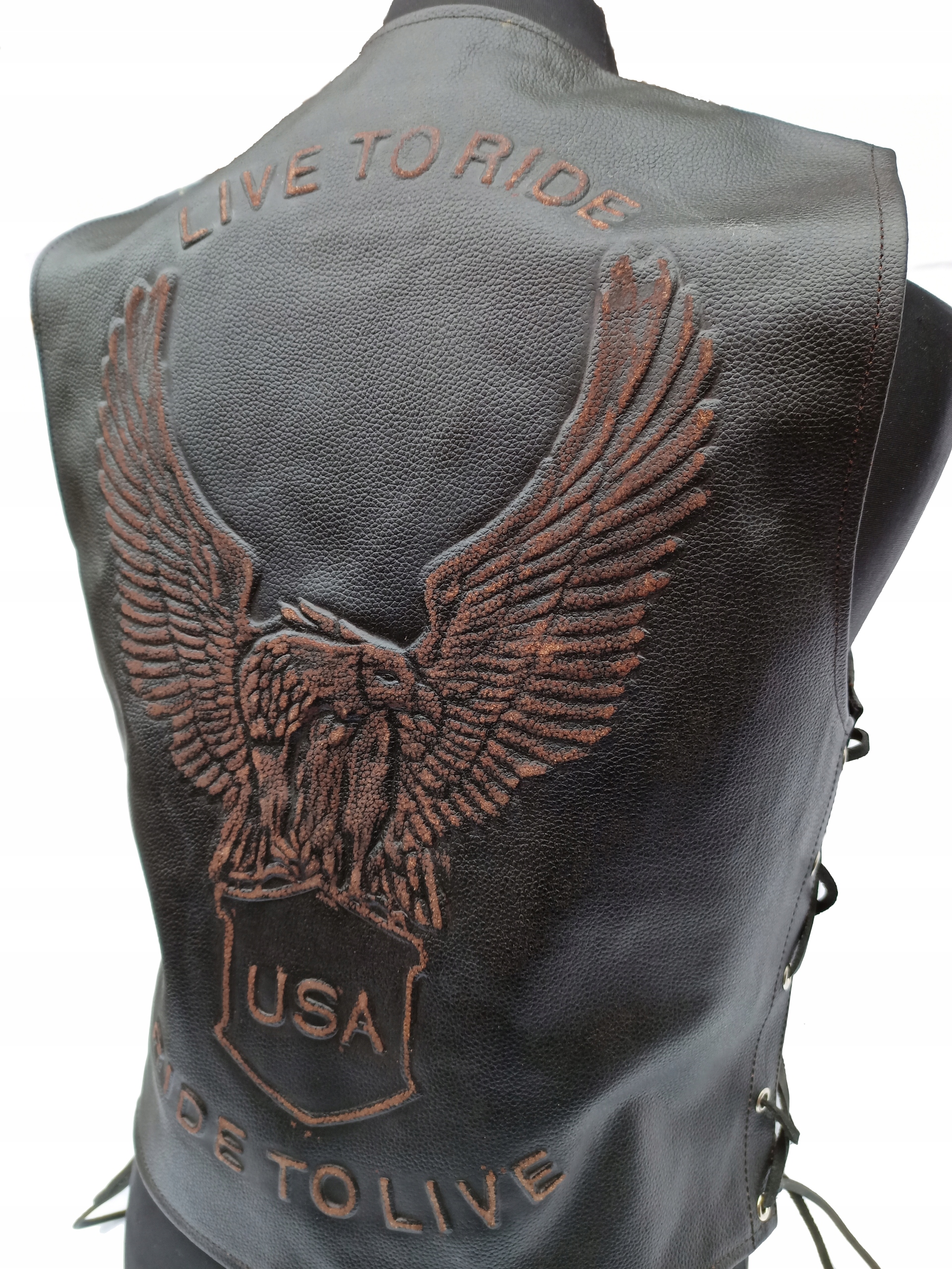 Жилетка з коров'ячої шкіри, регулюється лямками, застібається на кнопки, гарно тиснений орел з логотипом США та написами