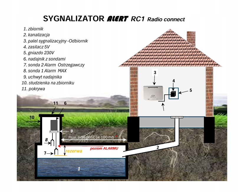 Alert RC1 was constructed for signaling of various alarm conditions depending on the sensors used to connected to the transmitter module, but its main purpose is monitoring liquid levels such as sewage (cesspool), rainwater (rainwater), various aquatic solutions in tanks, wells, sewage strings, sewage strings, etc.