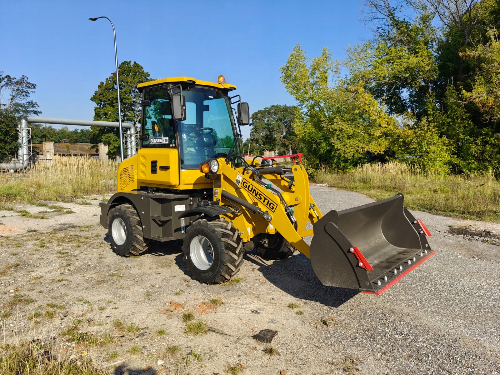 Зчленований колісний навантажувач, підходить для використання на фермах або будівельних майданчиках.