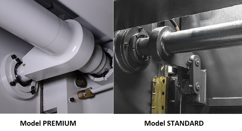 Торсіонна балка, відповідальна за синхронізацію ходу гідроциліндрів, підвішена на бічних стінках машини на суцільних підшипниках і з'єднана з переднім лонжероном, який рухається в положенні вгору/вниз. Згинальний верстат PREMIUM має безлюфтове з’єднання, тоді як прес STANDARD має дешевше рішення, з’єднане на шпильках.