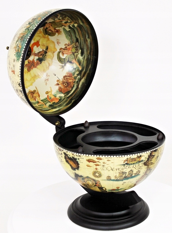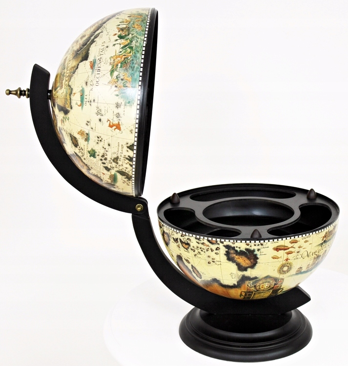 Я запрошую вас придбати привабливу баржу у формі земної кулі. Виріб виготовлено з екзотичного дерева. Всередині відкривається кулі є місце для пляшок і склянок. На поверхні кулі зображена карта стародавнього світу. Товар виглядає чудово. Він точно порадує всіх ваших гостей.