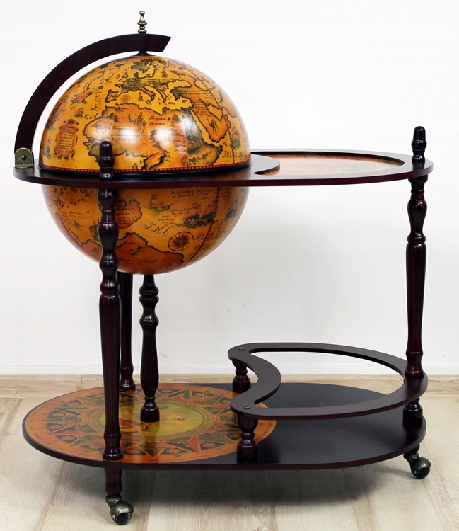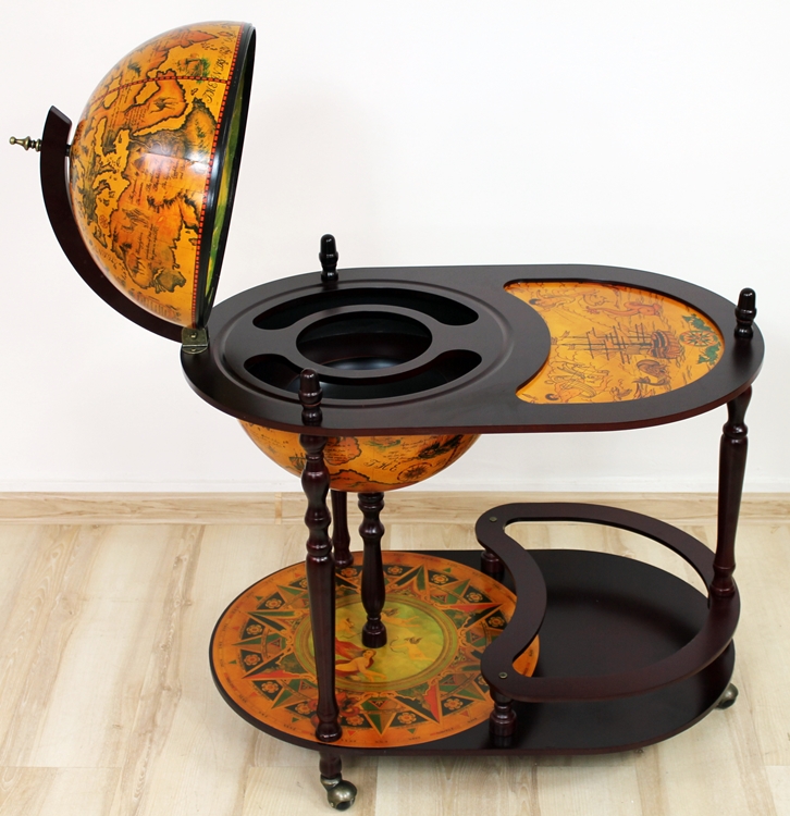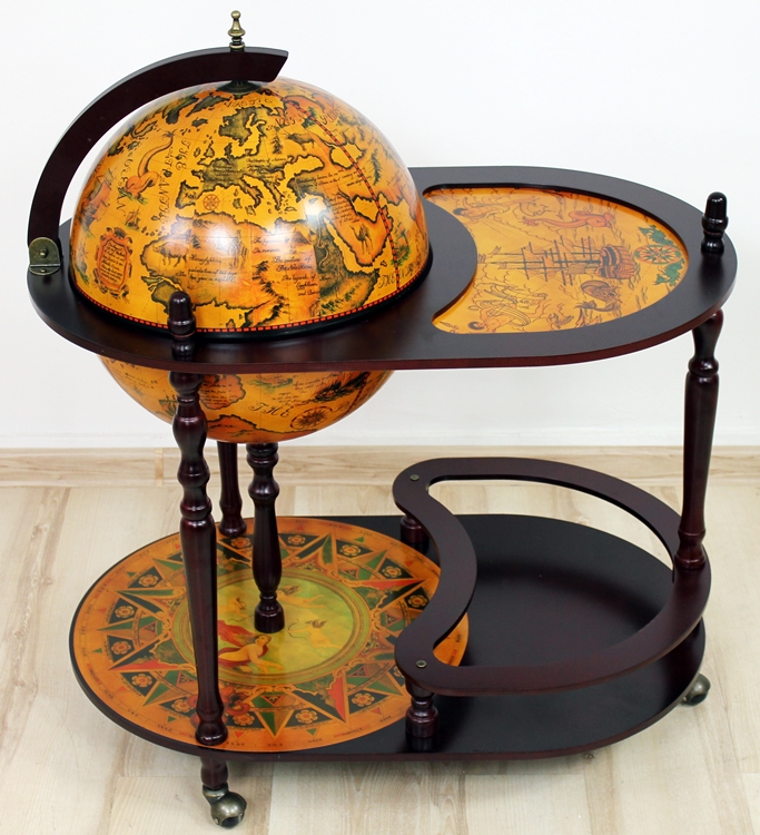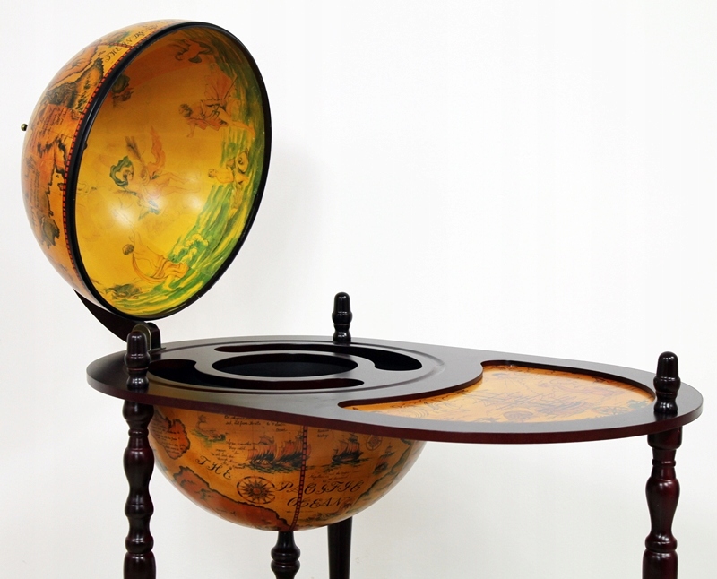 стильний предмет, який буде ідеальною ідеєю подарунка. Це дуже практично і функціонально. Всередині кулі для відкриття є місце для пляшок та окулярів. Нижня полиця має профільовану кришку для пляшок. На поверхні кулі є карта стародавнього світу. Барка має обертання, висота підшипників всього плеча 90 см, ширина 80 см
