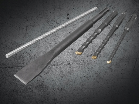 Аксесуари, що входять до набору: 1 плоске долото (250 мм), 3 свердла (Ø 6/8/10 мм x 150 мм), 1 металевий обмежувач глибини, 1 швидкий -розжимний патрон для свердла з круглим хвостовиком p>