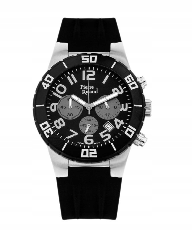 Модель P60007.YX24CH від Pierre Ricaud - це вишуканий чоловічий годинник, який поєднує спортивні елементи з елегантністю. Його головною особливістю є великий, круглий, чорний циферблат з білими індексами та великими арабськими цифрами на 2, 4, 6, 8, 10 та 12 годинах, що полегшує читання. Циферблат також містить три менших додаткових циферблата, які вказують на функцію хронографа, додаючи годиннику практичність. Срібні стрілки з білими деталями контрастують з циферблатом, що полегшує читання часу. Цілісний корпус годинника, ймовірно, зроблений з нержавіючої сталі, що свідчить про довговічність і стійкість до повсякденного використання. Ремінець, який виглядає як гумовий або інший пластик, підкреслює спортивний характер годинника, забезпечуючи комфорт носіння. Ці особливості роблять модель P60007.YX24CH універсальним годинником, придатним як для повсякденного носіння, так і для занять спортом.