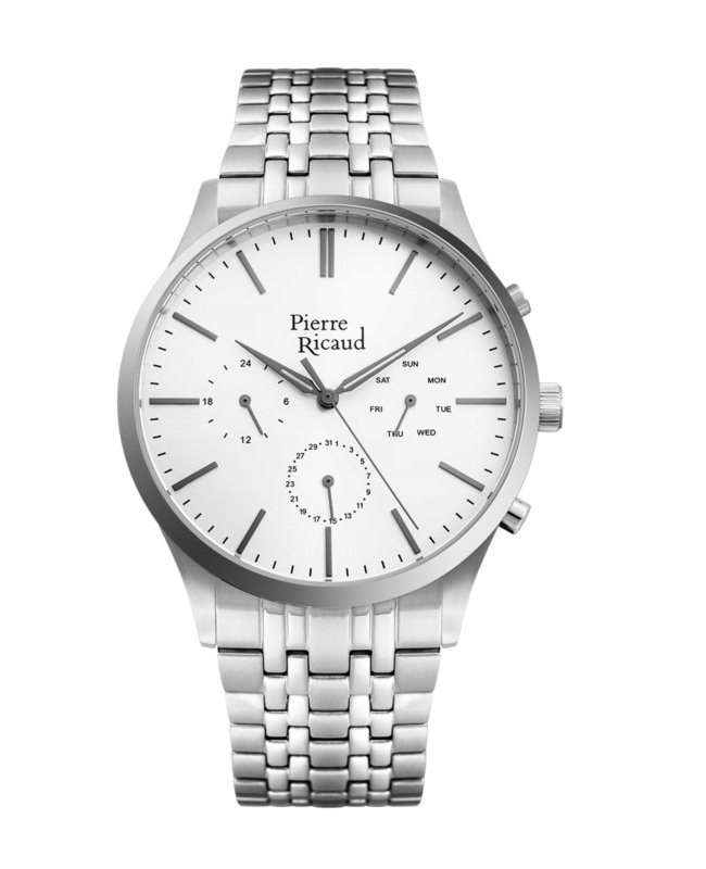 Модель P60027.5113QF від Pierre Ricaud — це чоловічий годинник, який представляє позачасову елегантність і функціональність. Його срібний сталевий браслет з тонкими ланками забезпечує класичний вигляд і комфорт носіння. Білий, легко читаний циферблат годинника оснащений чорними індексами та додатковими меншими циферблатами, які вказують день місяця та день тижня, що додає функціональності. Чорні стрілки та непомітні годинникові мітки дозволяють легко читати час. Це чудовий вибір для чоловіків, які шукають практичний і елегантний годинник. Модель P60027.5113QF поєднує в собі класичну естетику та зручність щоденного використання, що робить її ідеальним аксесуаром для кожного чоловіка.