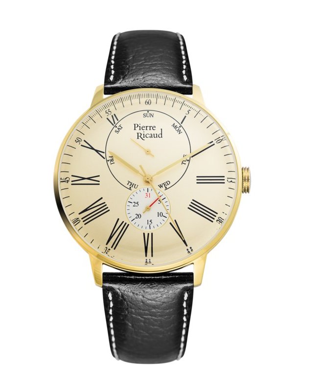 Модель P97219.1231QF від Pierre Ricaud - це чоловічий годинник із класичним та елегантним дизайном. Має золотий корпус і чорний шкіряний ремінець з білою строчкою. Циферблат кольору слонової кістки прикрашений римськими цифрами як годинниковими мітками та містить три допоміжні циферблати з інформацією про день тижня, місяць і маленькі секунди, а також має віконце дати. Золоті стрілки та деталі на циферблаті ідеально поєднуються з насиченим відтінком корпусу, надаючи годиннику відчуття розкоші. Ця модель є ідеальним вибором для людей, які цінують позачасову естетику та функціональність.