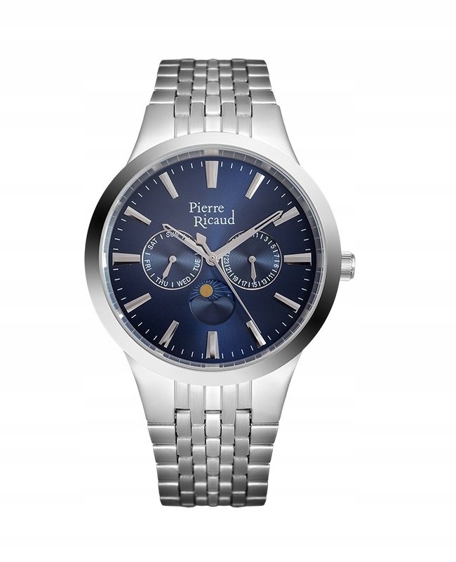 Модель P97225.5115QF від Pierre Ricaud — це чоловічий годинник із незмінним дизайном, який поєднує класику з сучасними елементами. Годинник має прозорий темно-синій циферблат із контрастними сріблястими індексами та стрілками, які полегшують читання. До додаткових функцій даної моделі входить індикація фази місяця і днів тижня, що робить її не тільки аксесуаром, але і практичним інструментом для щоденного використання. Металевий браслет сріблястого кольору з ледь помітним матовим покриттям елегантний і міцний, а безпечна застібка запобігає випадковому відкриванню. Цей годинник є чудовим вибором для чоловіків, які цінують функціональність і стиль.