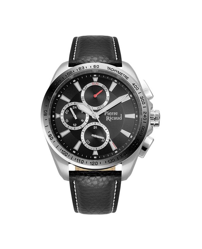 Годинник Pierre Ricaud, модель P97235.5214QF - приклад вишуканого спортивного годинника з функціональними аксесуарами. Чорний багатофункціональний циферблат з білими та червоними вставками не тільки стильний, але й дозволяє легко читати різну інформацію, наприклад дату та дні тижня. Тахіметр на ободі додає функціональність для людей, які цікавляться автоспортом або хочуть виміряти швидкість. Чорний шкіряний браслет з білою строчкою класичний і елегантний, але зручний у носінні. Ця модель - ідеальний вибір для активних і стильних чоловіків, які цінують годинники з додатковими функціями.