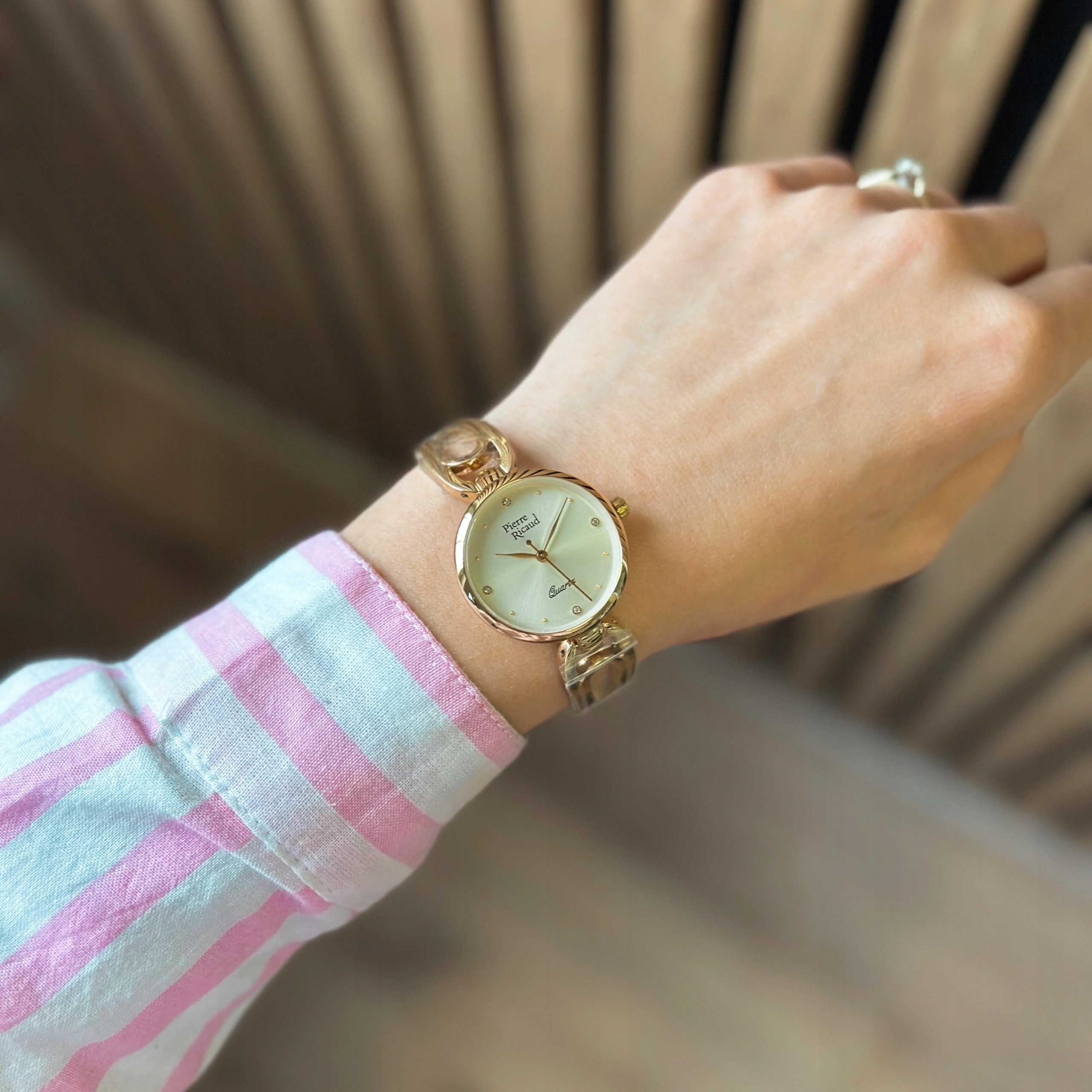 - Циферблат: золото, аналоговий дисплей часу, з цирконами.