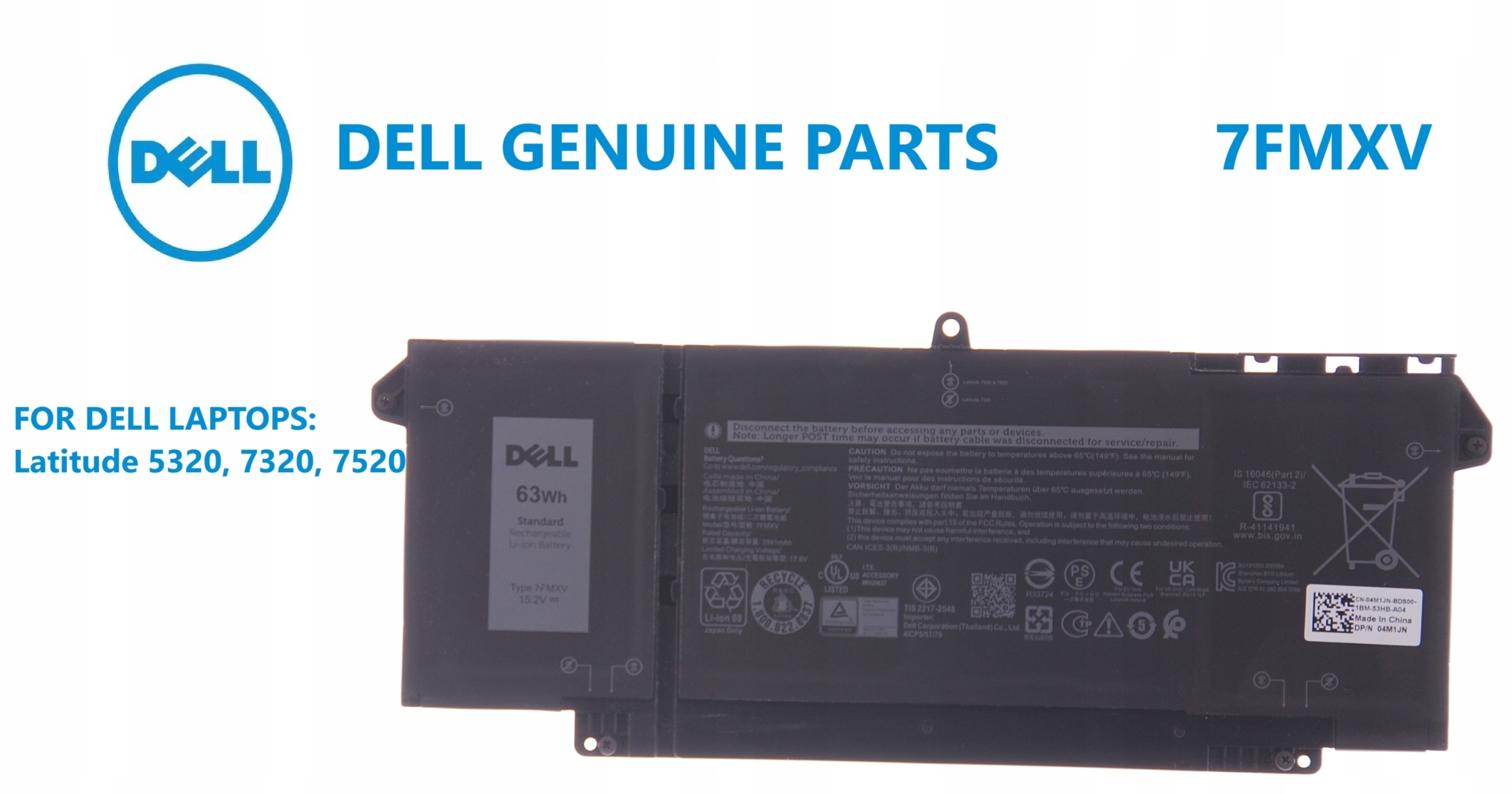 Новий, оригінальний акумулятор Dell 7FMXV -це високоякісна батарея, присвячена ноутбукам серії широти. Завдяки напрузі 15,5 В та потужностям 63 Вт, вона забезпечує тривалий робочий час та повна сумісність з Dell.