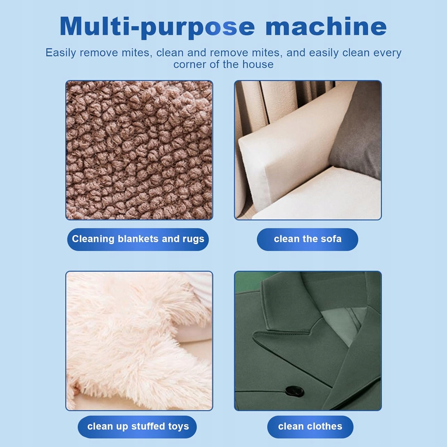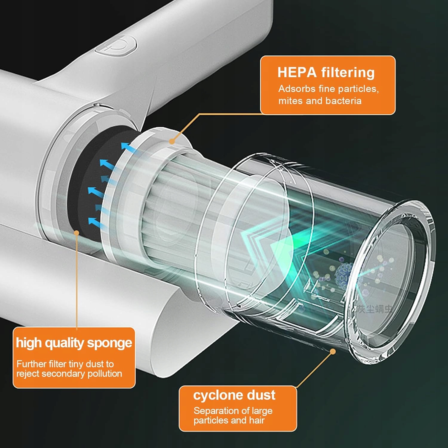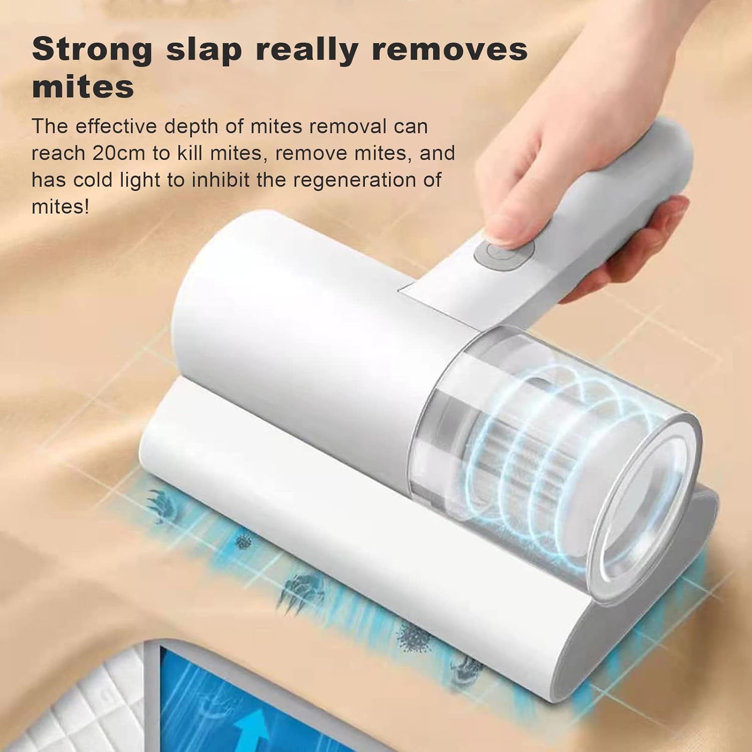 Подвійні клапани Ручний вакуумний матрац має велику площу поверхні з міцним подвійним клапаном для видалення комах і пилових кліщів, що дозволяє всьому вистрибувати з поверхні. 260 нм УФ. Пилосос для матраців може випромінювати УФ-випромінювання з довжиною хвилі 260 нм, яке не розпізнає людське око, і ефективно видаляє пилових кліщів. Ручний ультрафіолетовий пилосос із сильним всмоктуванням використовує багатоканальне сильне всмоктування, миттєво вдихає та збирає кліщів у пилозбірник, не блокуючи фільтр. Зручна ручка, ергономічний матрацник, зручно тримати, забезпечує високу ефективність і економію праці, дозволяє прибрати все ліжко за 5 хвилин. Експлуатація Бездротовий пилосос для матраців, вбудований у літієву батарею ємністю 1500 мАг, забезпечує тривалий час використання, тож ви можете вільно користуватися ним без обмежень за допомогою шнура.
