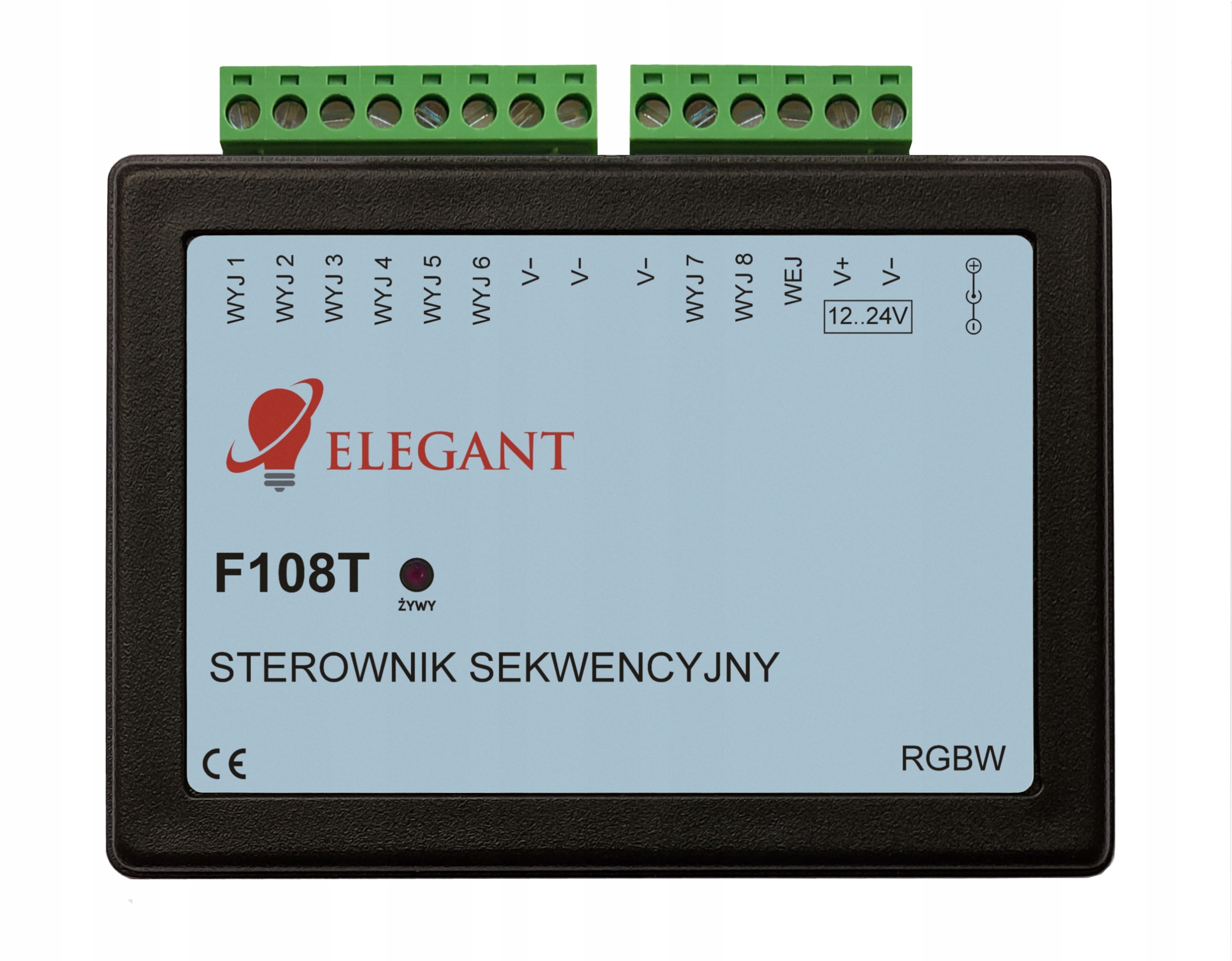 Драйвер F108 RGBW дозволяє отримати ефект обертання/розширення світла щоразу, коли ви його вмикаєте чи вимикаєте. Контролер призначений для цифрових світлодіодних стрічок TM1814. Це рішення ідеально підходить для коридорів, сходів, підвісних стель, полиць, ніш і будь-де, де ми хочемо досягти інноваційного ефекту освітлення. Контролер має кілька попередньо завантажених ефектів, наприклад, розмотування стрічки зсередини.