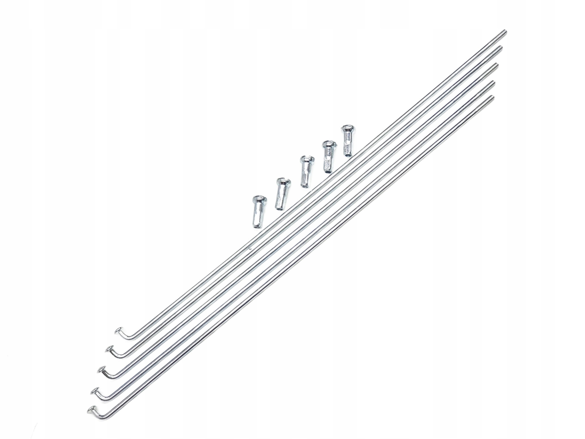 НОВИЙ Комплект спиць переднього колеса (20 дюймів) для велосипедів Romet Czajka Flaming Duet Karlik Sokół, що відповідає круглому ободу - новіший тип, після 1980 року, у випадку трапецієподібного обода (старішого типу), не перевірено, може не підійти або може знадобитися вкоротити спицю, щоб запобігти проколу камери. Набір підібрано відповідно до оригінальних розмірів Zakłady Rowerowe Romet, присвячених вищезгаданим велосипедам. У комплекті: 5 спиць і 5 ніпелів.