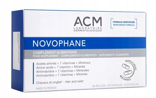 Дієтична добавка Новофан містить біотин, який допомагає підтримувати красиве волосся та здорову шкіру. Цинк сприяє підтримці здорових нігтів, волосся та шкіри. Вітамін B6 бере участь в синтезі цистеїну і допомагає регулювати гормональну діяльність. Крім того, вітамін В6 разом з вітаміном С і залізом підтримують належне функціонування імунної системи. Крім того, вітамін С підтримує належне вироблення колагену для забезпечення належного функціонування шкіри.