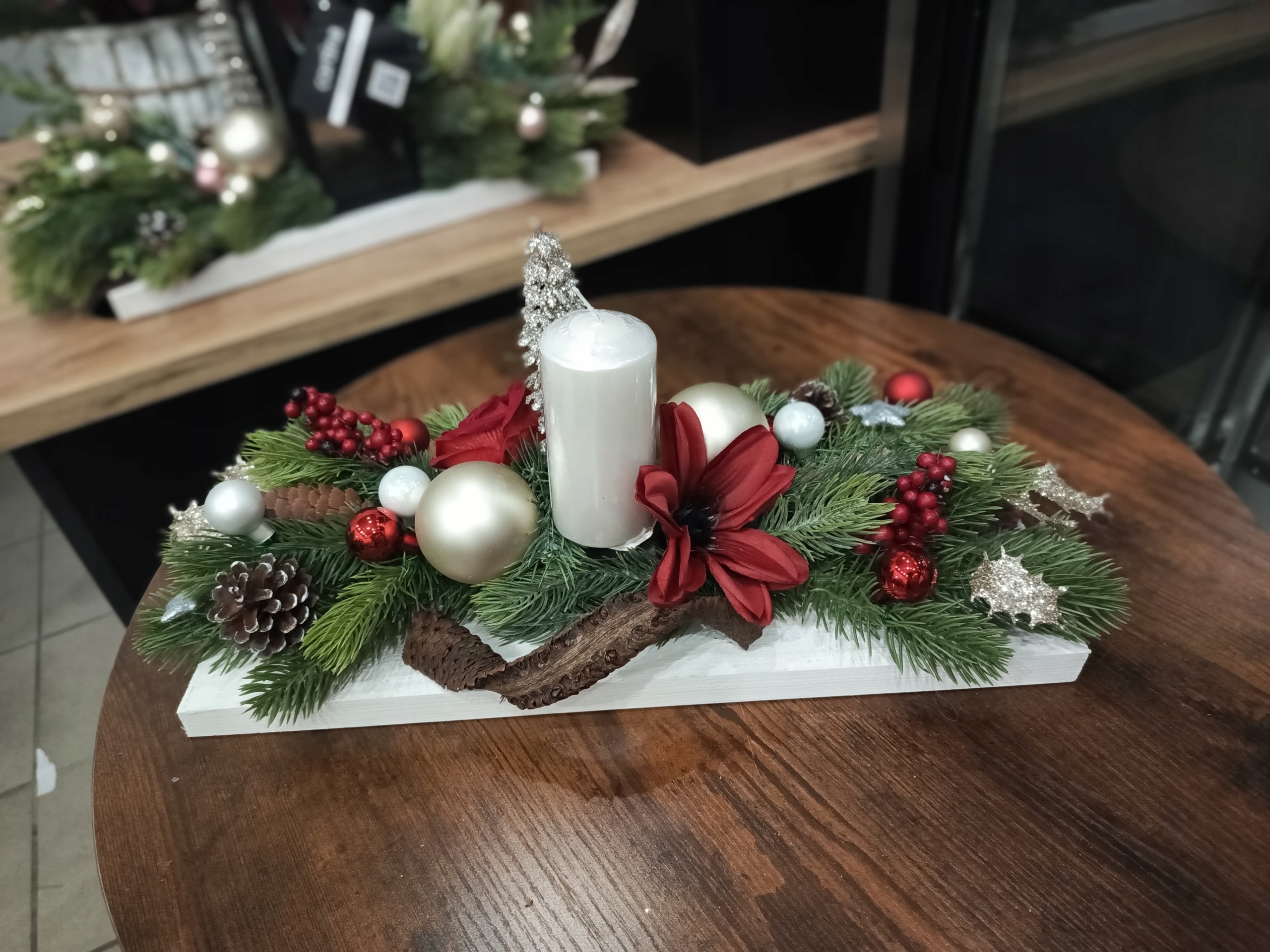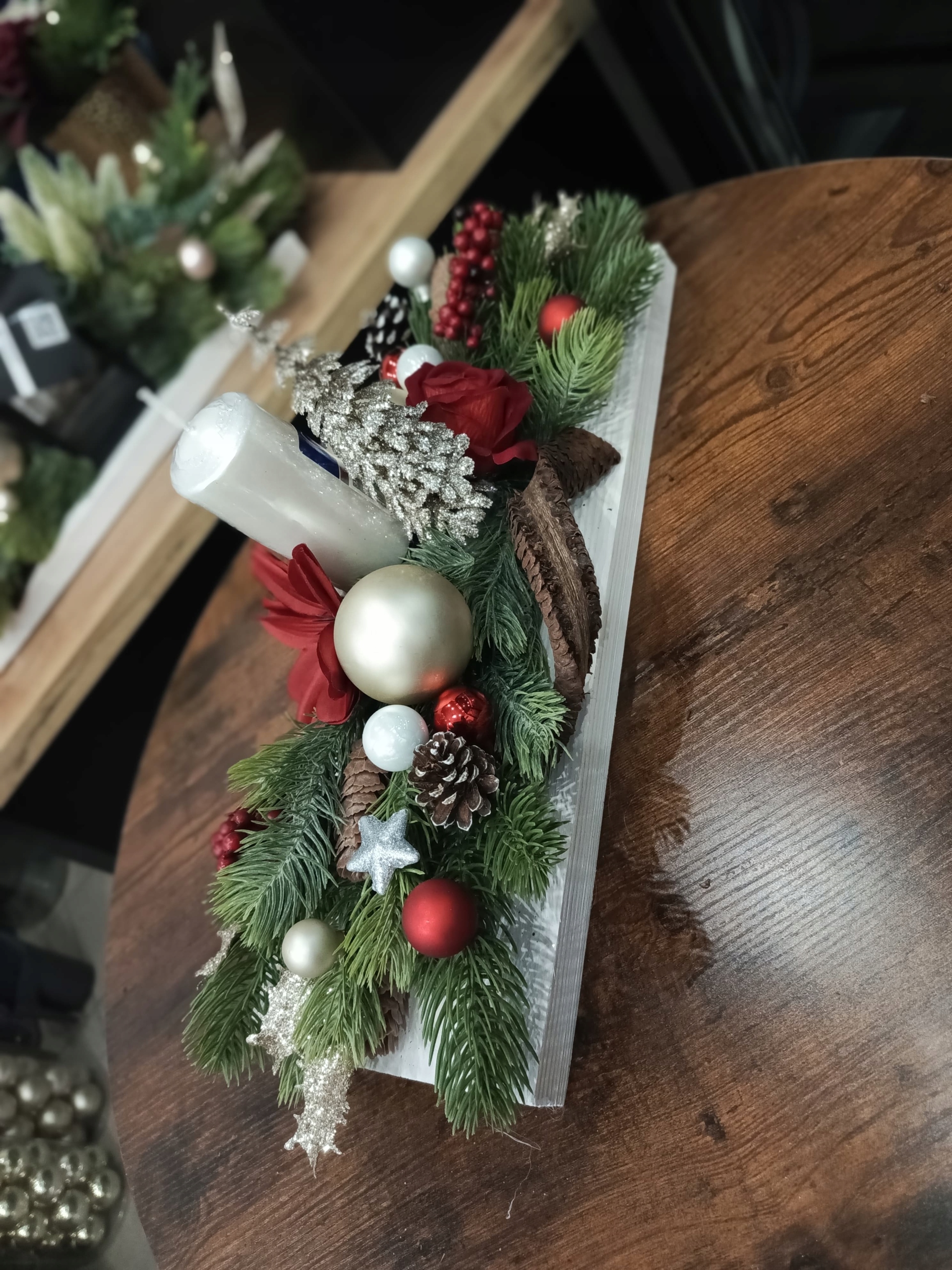 - Оздоблення включає, серед іншого: білу дерев'яну дошку, штучні ялинові гілки, штучні. квіти та ялинка, соснові шишки, кора, листя та скляні дрібнички та багато інших менших елементів.