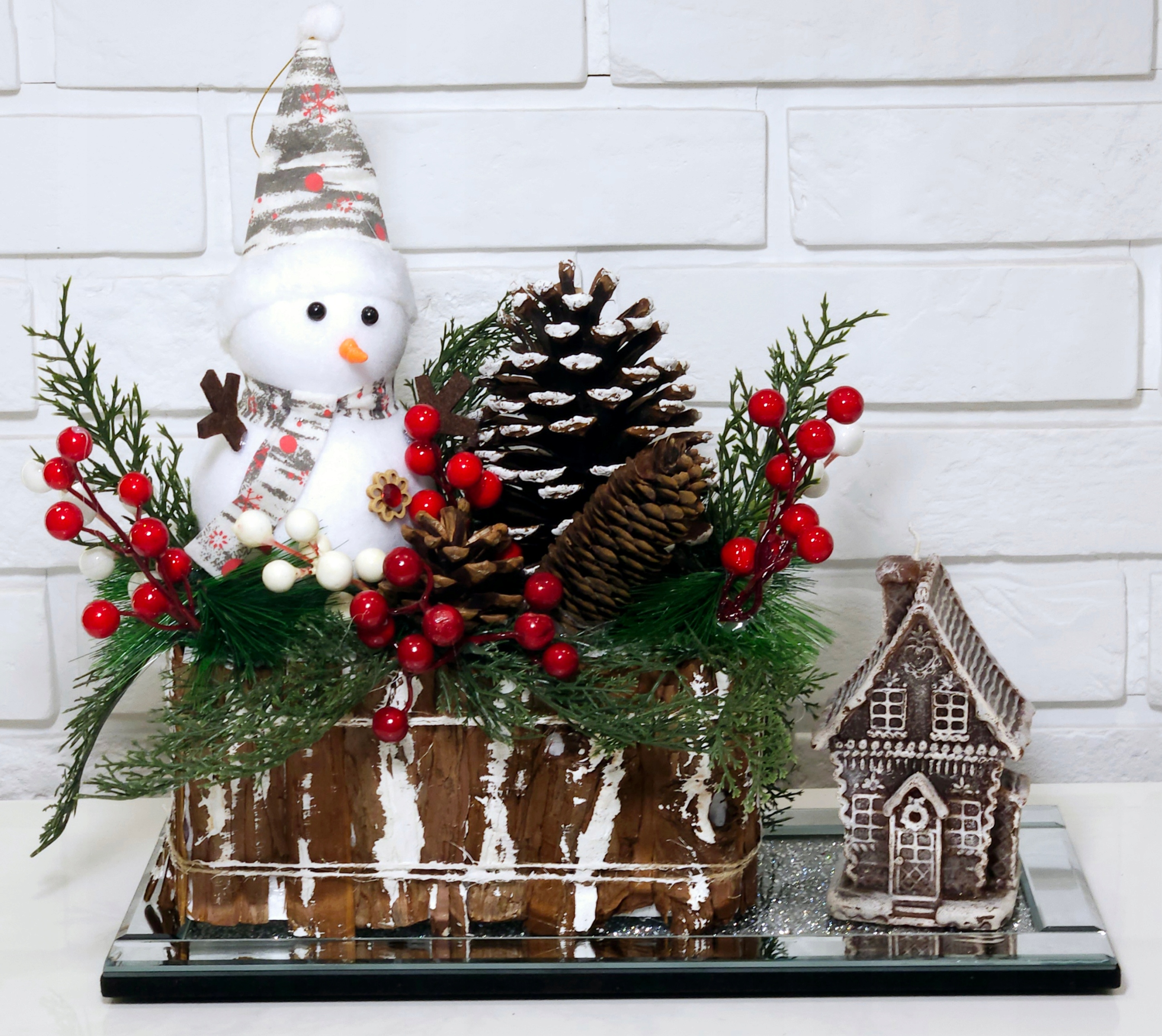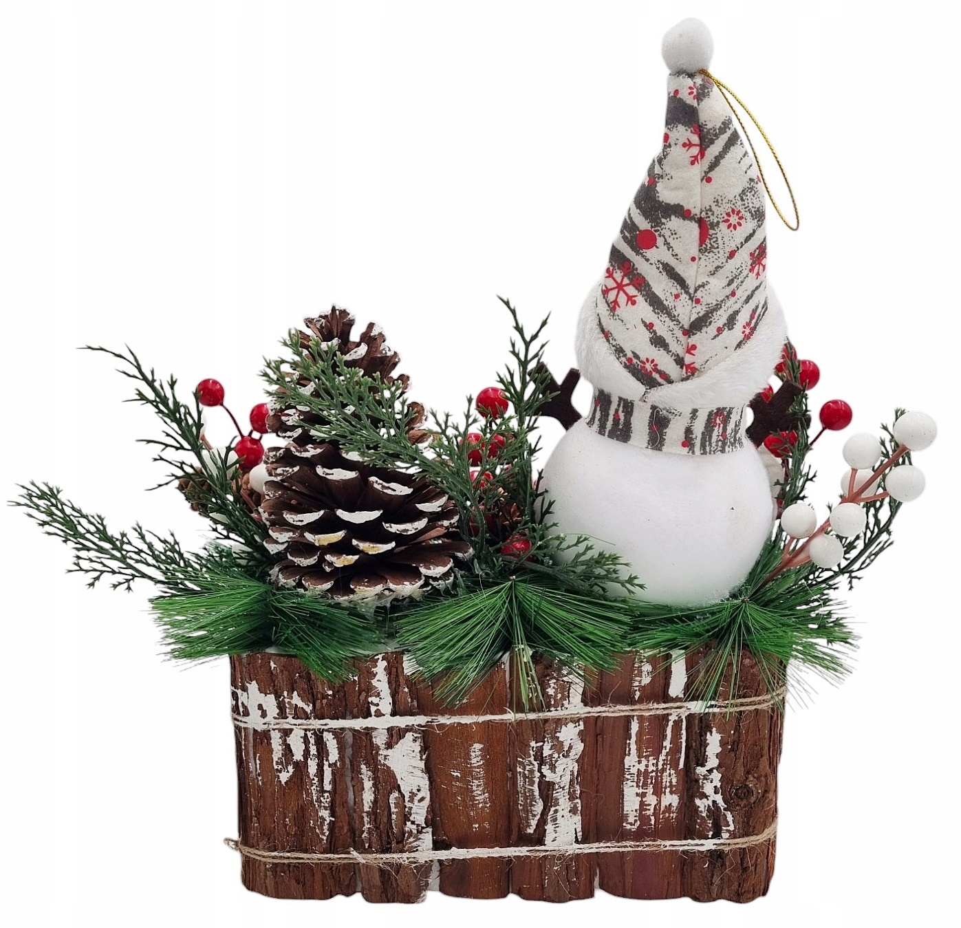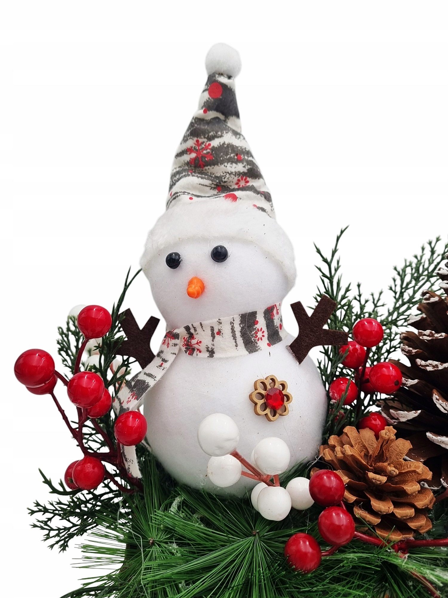 Горобина з її насичено-червоними плодами є яскравим кольоровим акцентом у всьому декорі. Його соковитий колір чудово контрастує з зимовими, приглушеними тонами хвої та дерева, вносячи в оздоблення радісну нотку. Гілки горобини, розміщені в різних частинах композиції, поруч зі сніговиком і шишками, створюють гармонійне ціле.