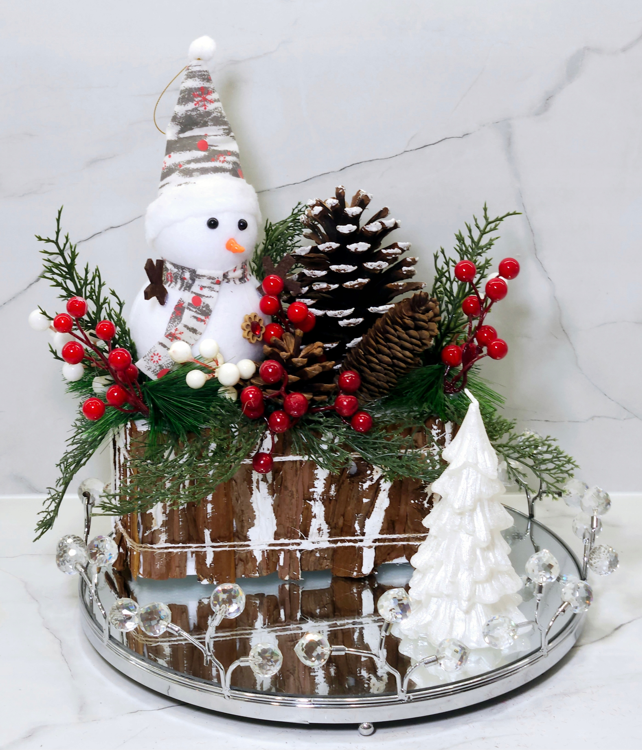 Така прикраса зі сніговиком, сосновими шишками та горобиною на дерев’яній основі є чудовою прикрасою, яка поєднує традиції з природою, привносячи справжню святкову атмосферу у вашому домі.