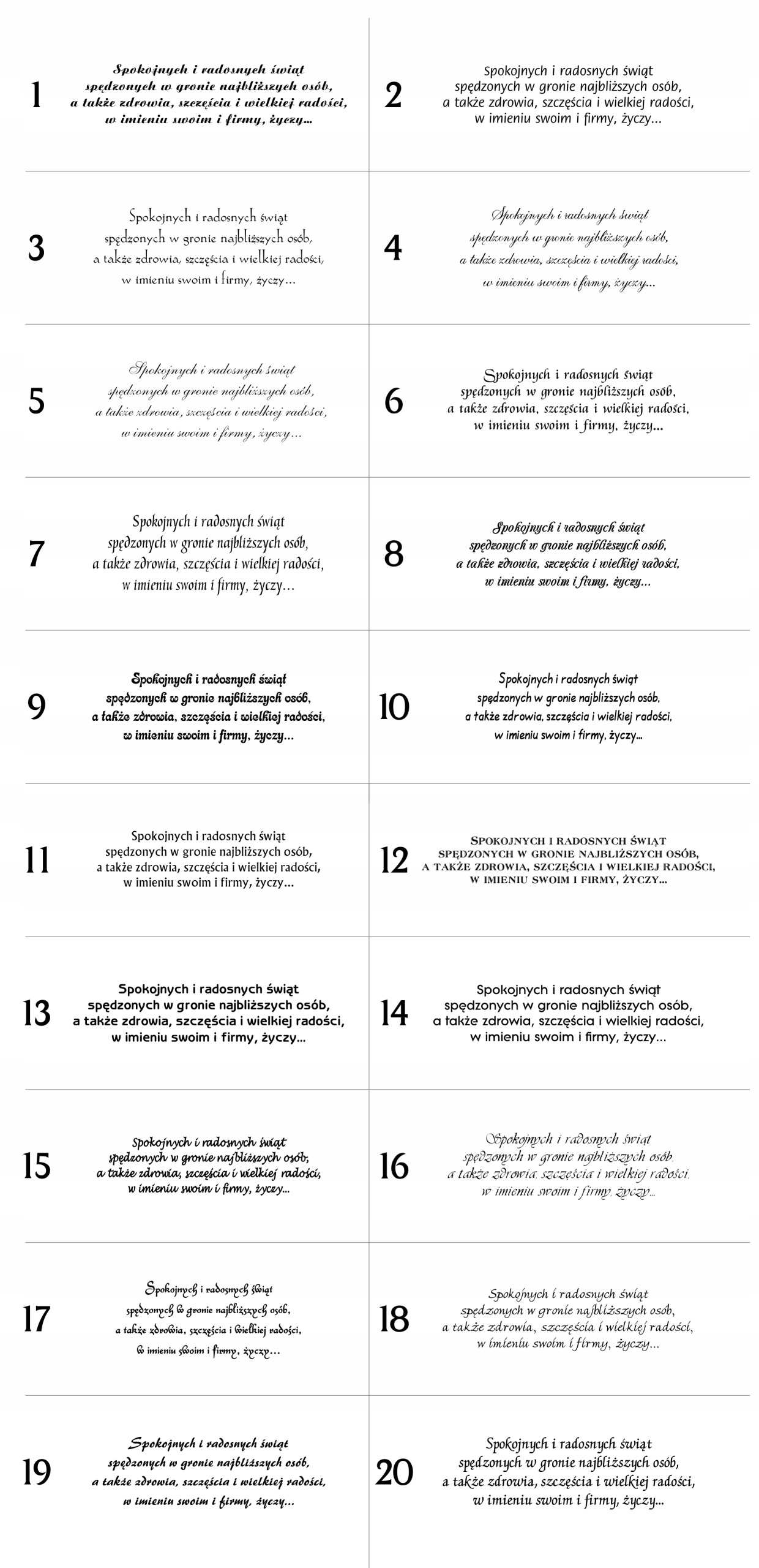 Новорічні листівки для компаній, бізнесу з колекції EKO. Ми друкуємо візитки тільки на основі наших графічних шаблонів, доступних у візуалізаціях нижче. На графічний шаблон ми розміщуємо Ваш логотип або назву компанії та зміст Ваших побажань. Ми також можемо включити скан підпису, наприклад, президента чи власника.
