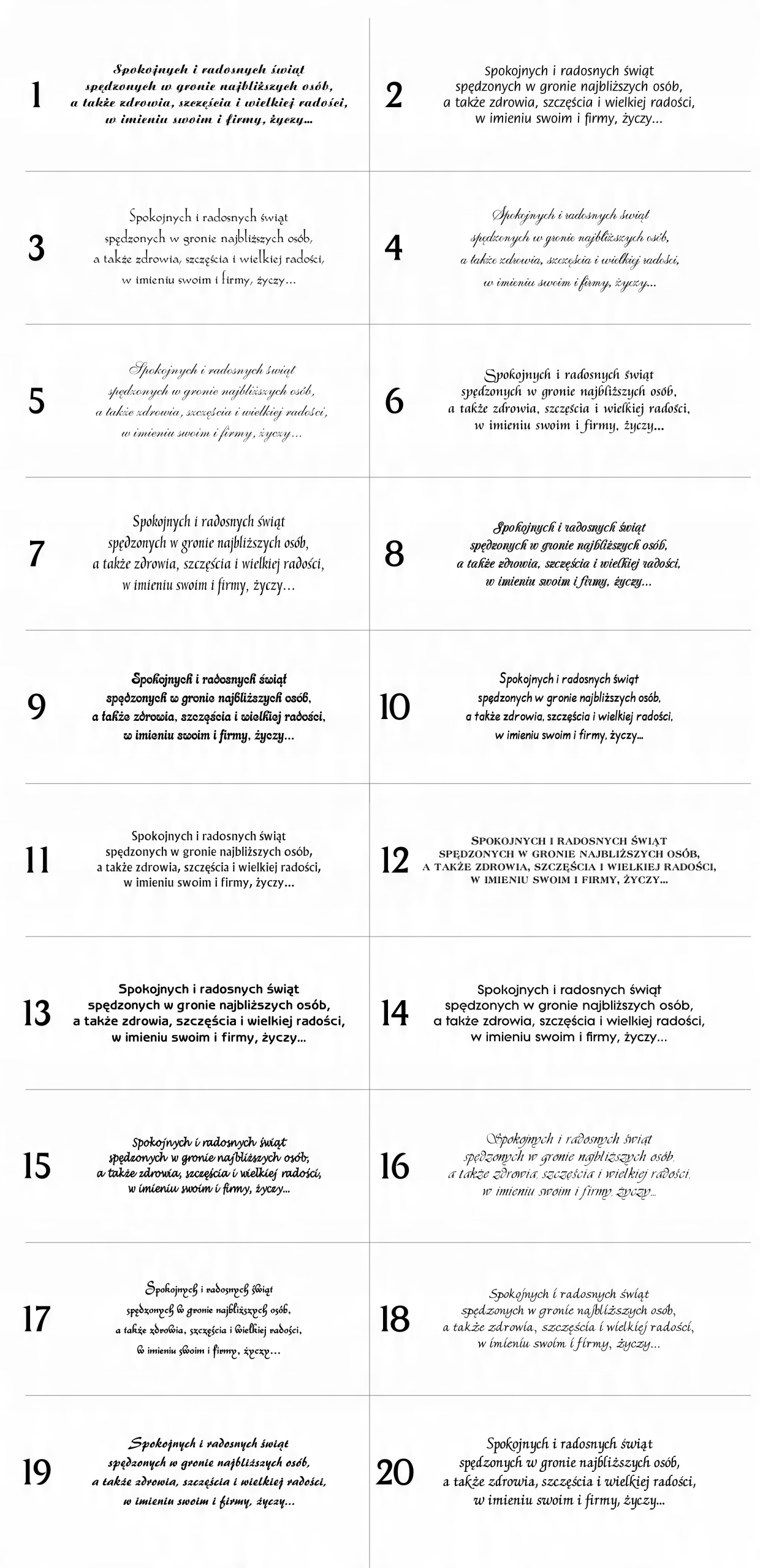 Різдвяні листівки для компаній, бізнесу з колекції Canvas. Ми друкуємо візитки лише на основі наших графічних шаблонів, доступних у візуалізаціях нижче. На графічний шаблон ми розміщуємо Ваш логотип або назву компанії та зміст Ваших побажань. Ми також можемо включити скан підпису, наприклад, президента чи власника.