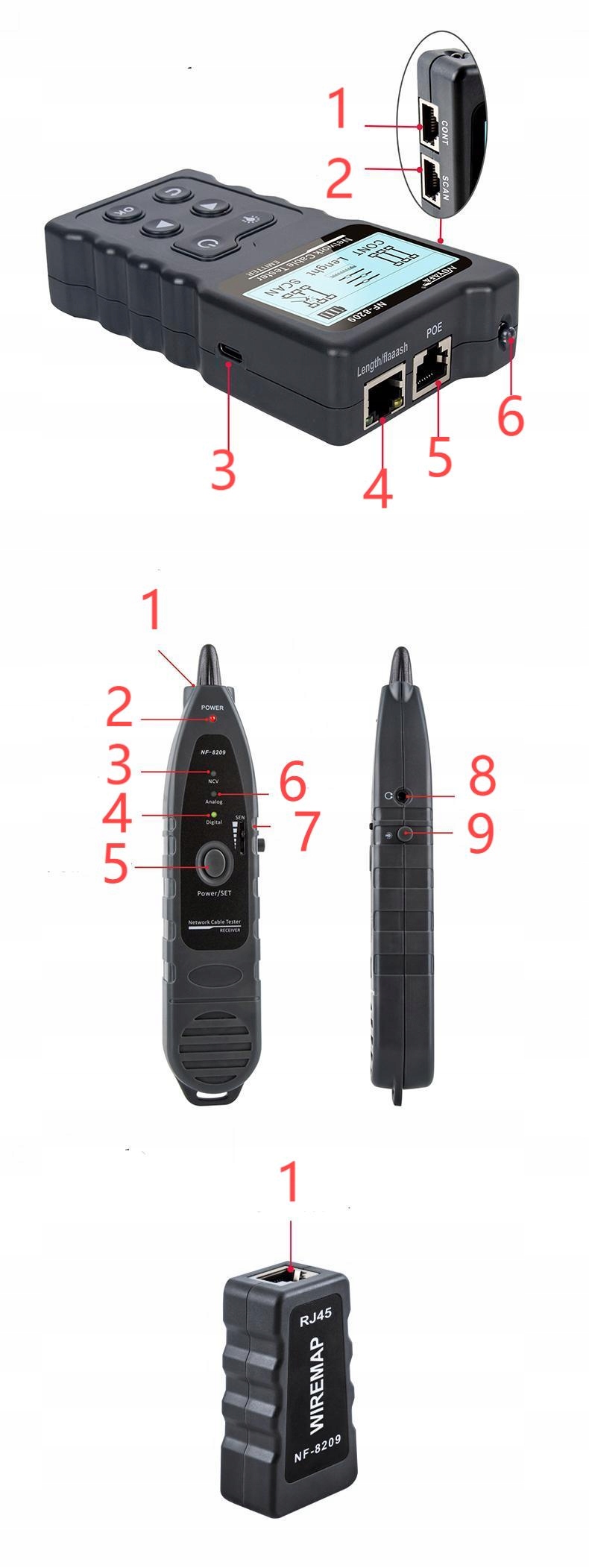 - Функція передавача: карта кабелю, перевірка довжини, сканування кабелю, перевірка PoE, спалах порту, функція освітлення.